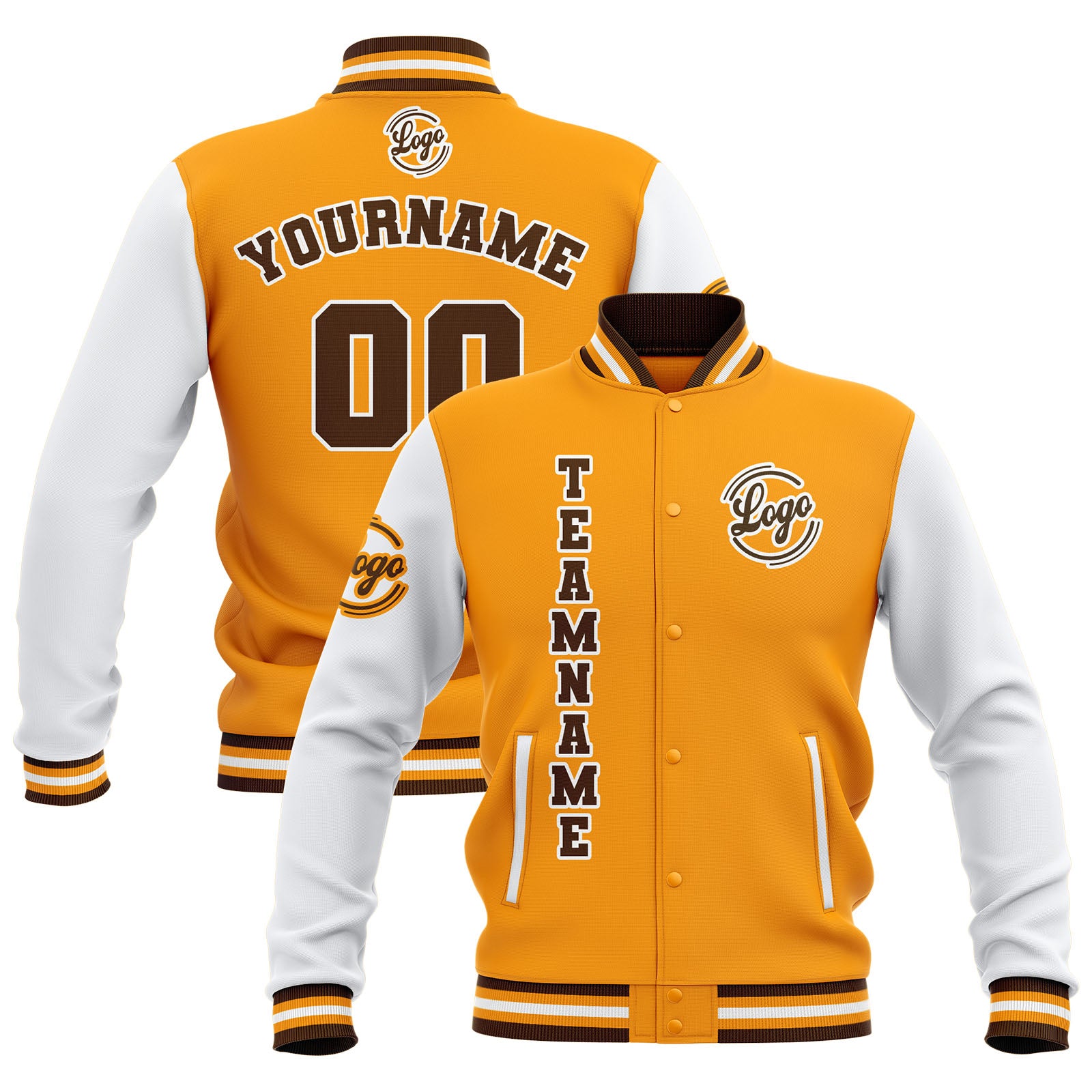 Benutzerdefiniert Gelb Weiß Braun Wasserdichte Varsity Jacken Personalisiert genäht Name Nummer Logo zu Letterman Jacken