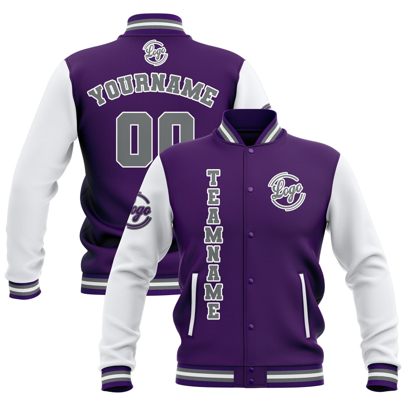 Benutzerdefiniert Lila Weiß Grau Wasserdichte Varsity Jacken Personalisiert genäht Name Nummer Logo zu Letterman Jacken