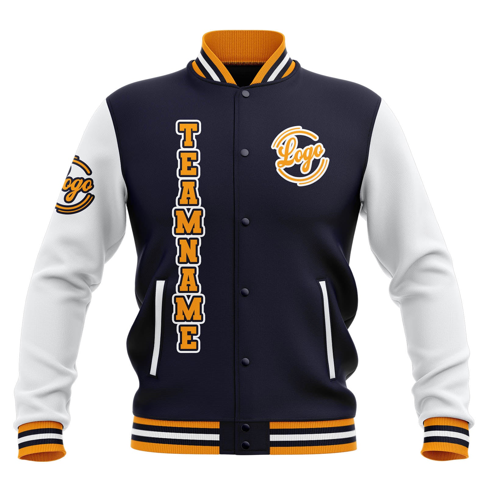 Benutzerdefiniert Marine Weiß Gelb Wasserdichte Varsity Jacken Personalisiert genäht Name Nummer Logo zu Letterman Jacken
