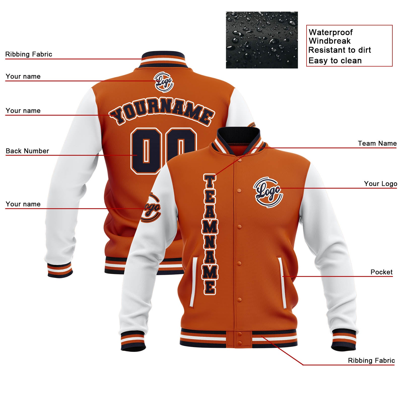 Benutzerdefiniert Orange Weiß Marine Wasserdichte Varsity Jacken Personalisiert genäht Name Nummer Logo zu Letterman Jacken