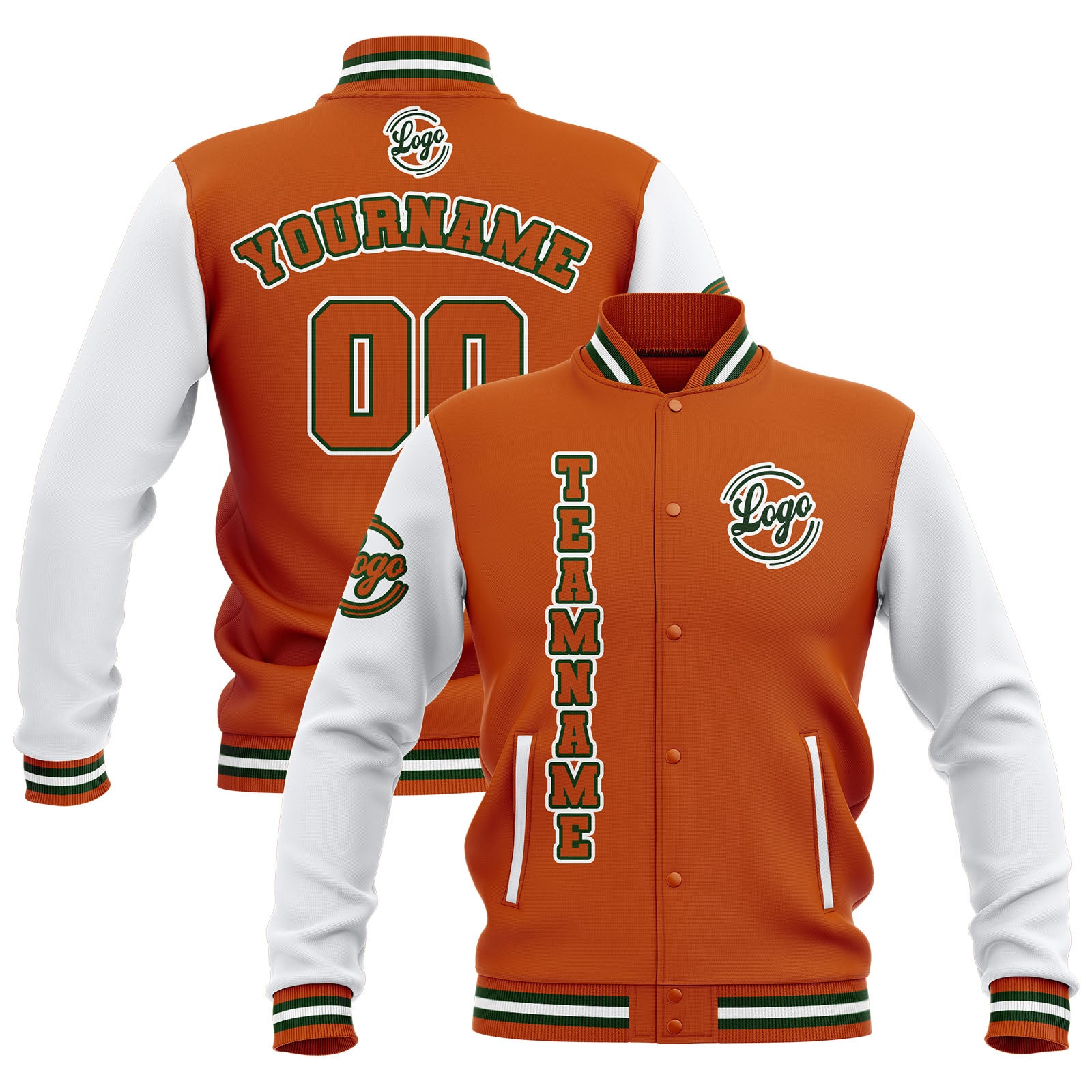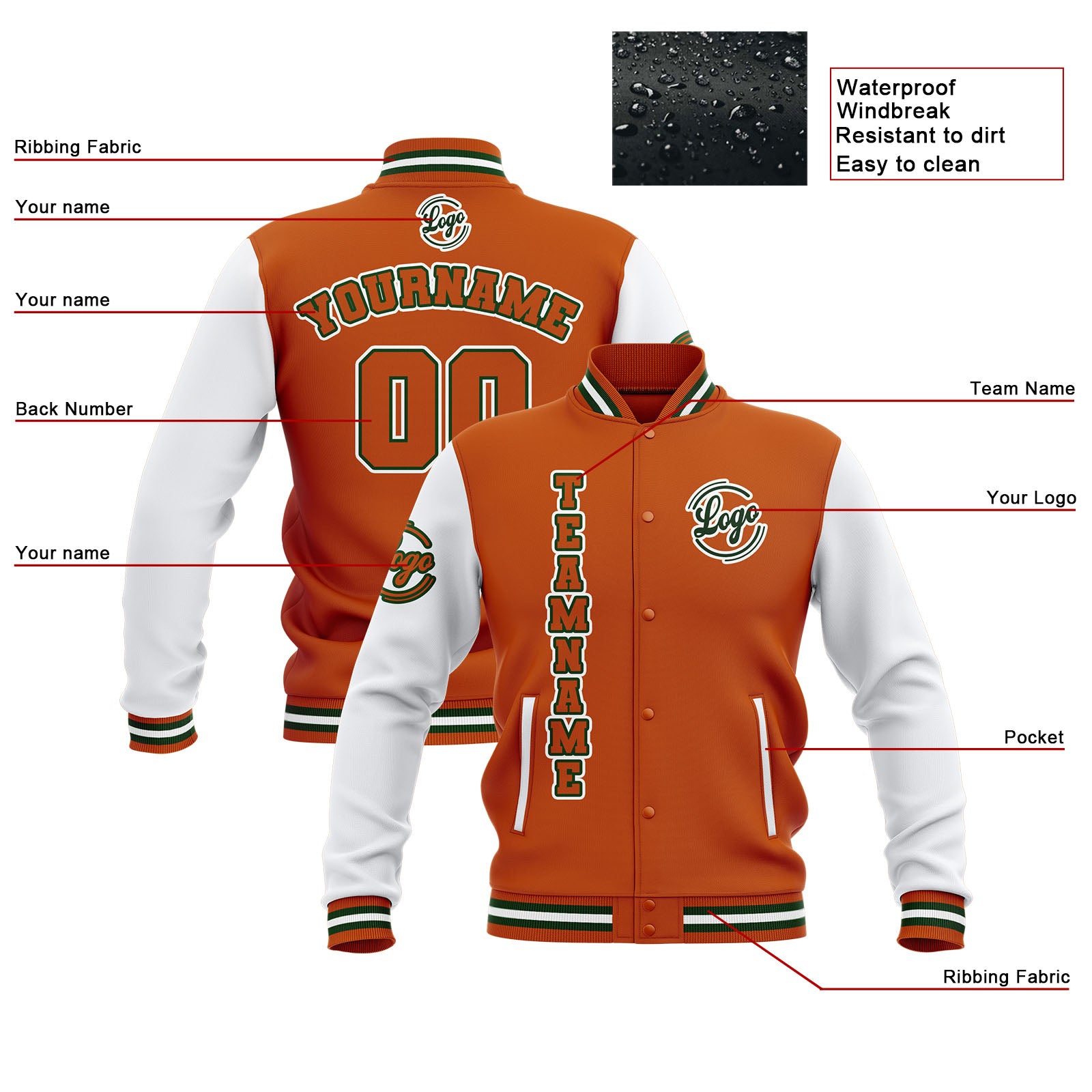 Benutzerdefiniert Orange Weiß Wasserdichte Varsity Jacken Personalisiert genäht Name Nummer Logo zu Letterman Jacken