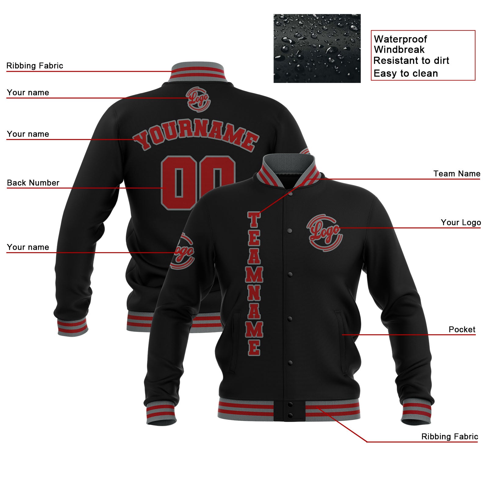 Benutzerdefiniert Schwarz Rot Grau Wasserdichte Varsity Jacken Personalisiert genäht Name Nummer Logo zu Letterman Jacken