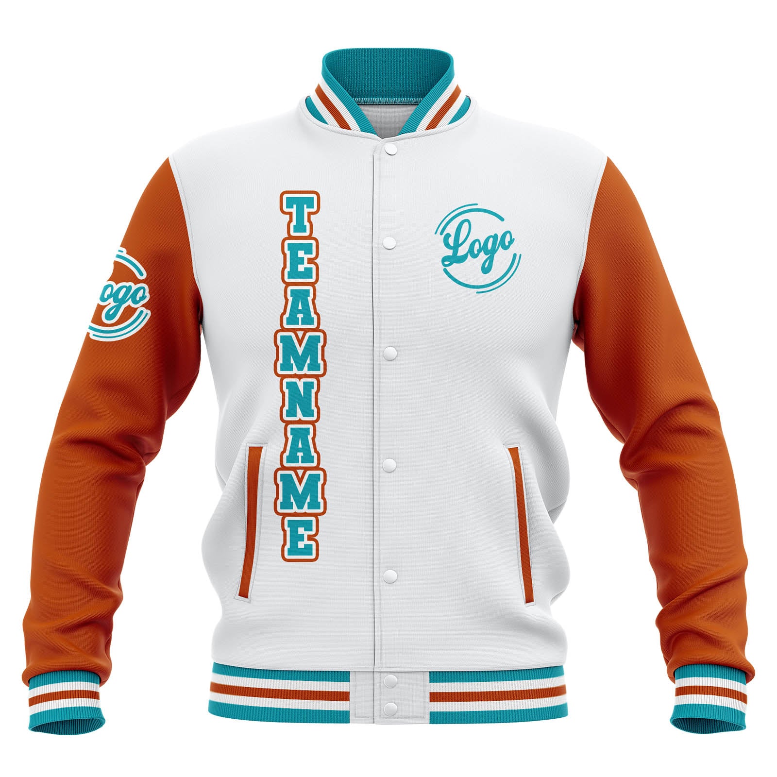 Benutzerdefiniert Weiß Orange Teal Wasserdichte Varsity Jacken Personalisiert genäht Name Nummer Logo zu Letterman Jacken