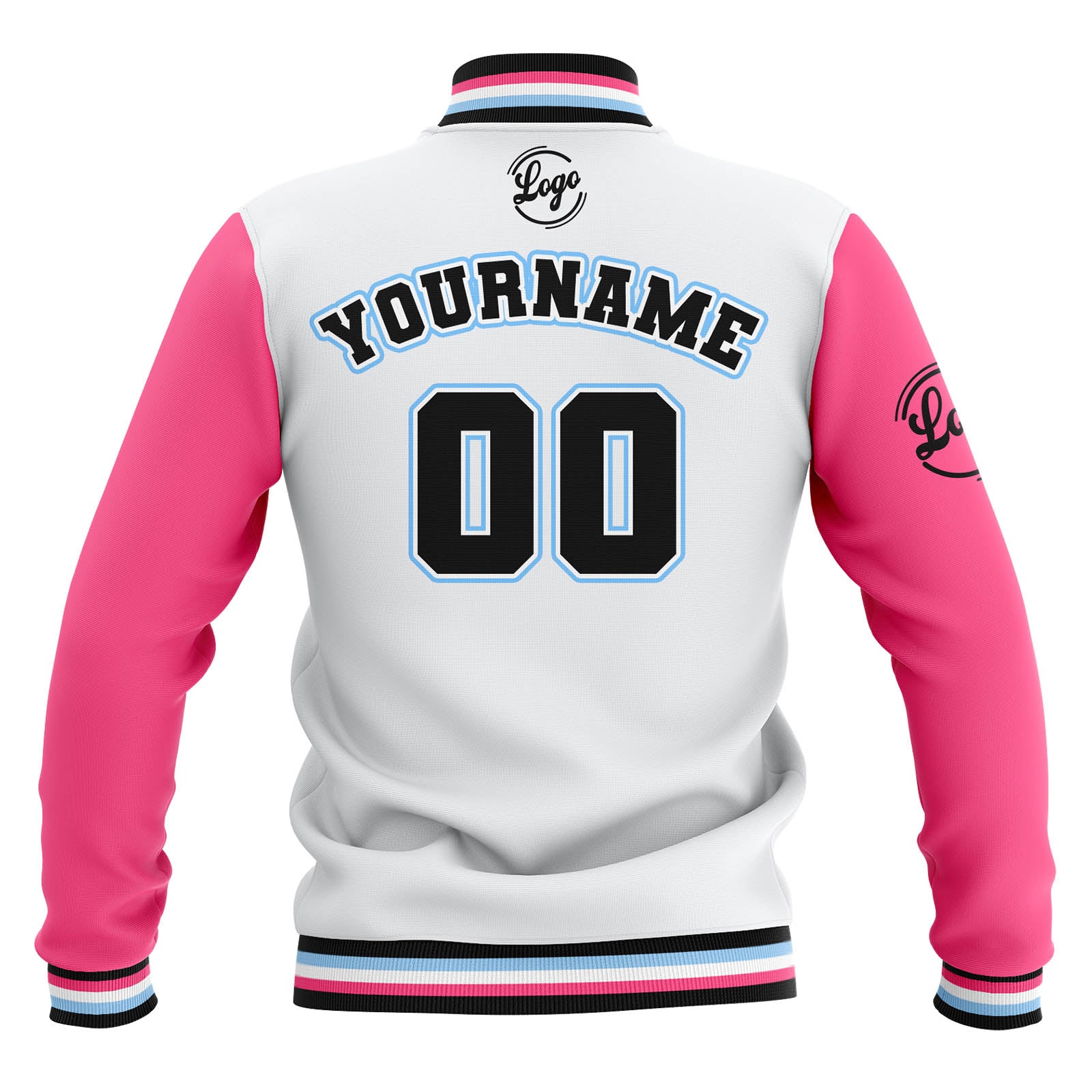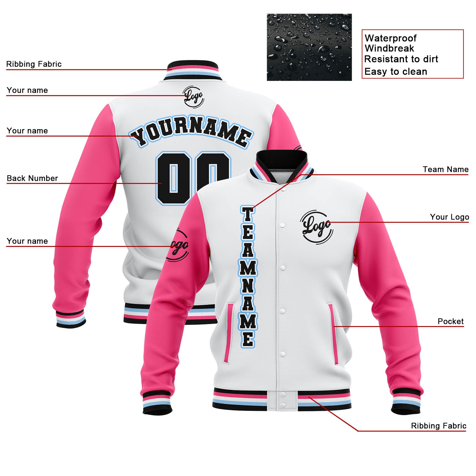 Benutzerdefiniert Weiß Rosa Schwarz Wasserdichte Varsity Jacken Personalisiert genäht Name Nummer Logo zu Letterman Jacken