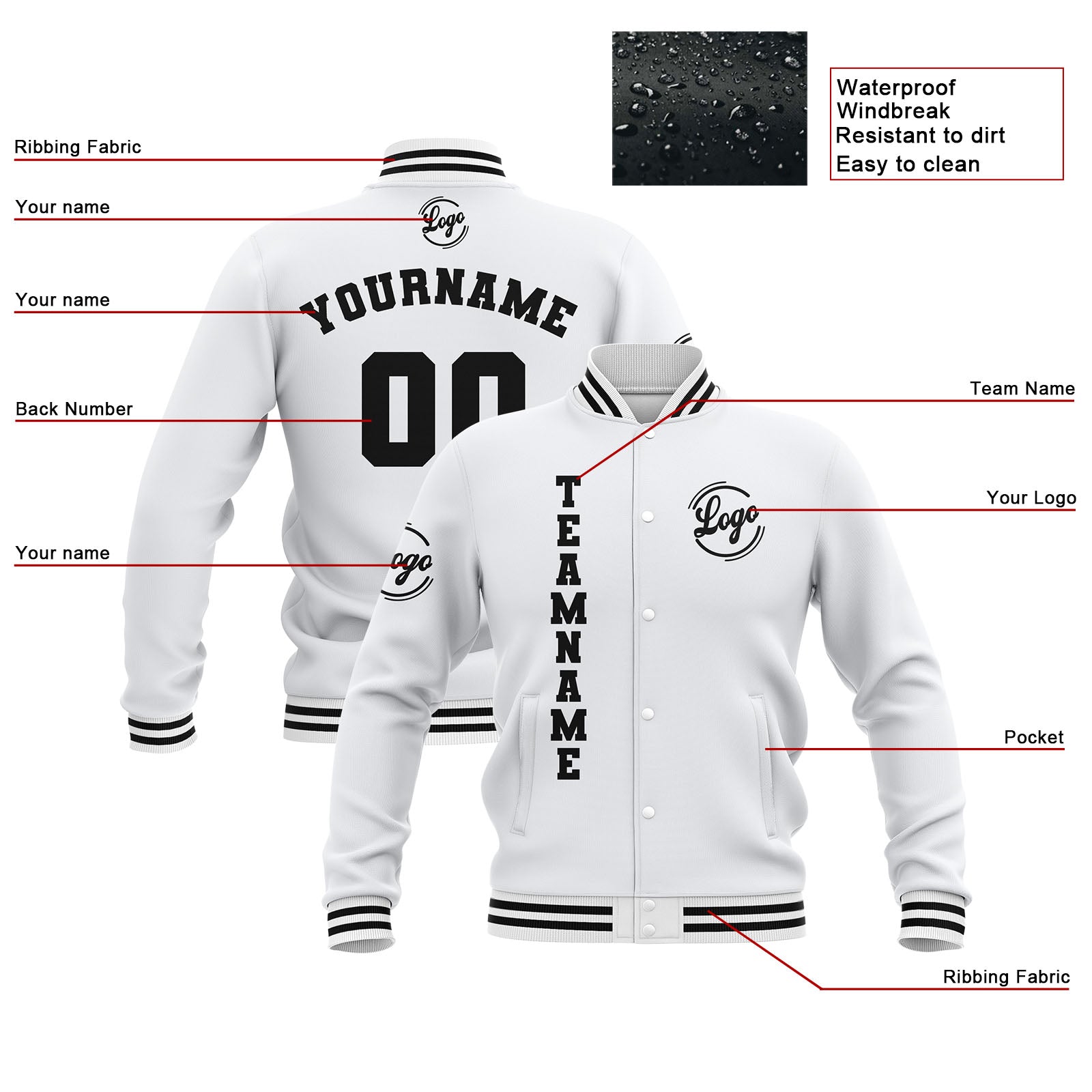 Benutzerdefiniert Weiß Wasserdichte Varsity Jacken Personalisiert genäht Name Nummer Logo zu Letterman Jacken