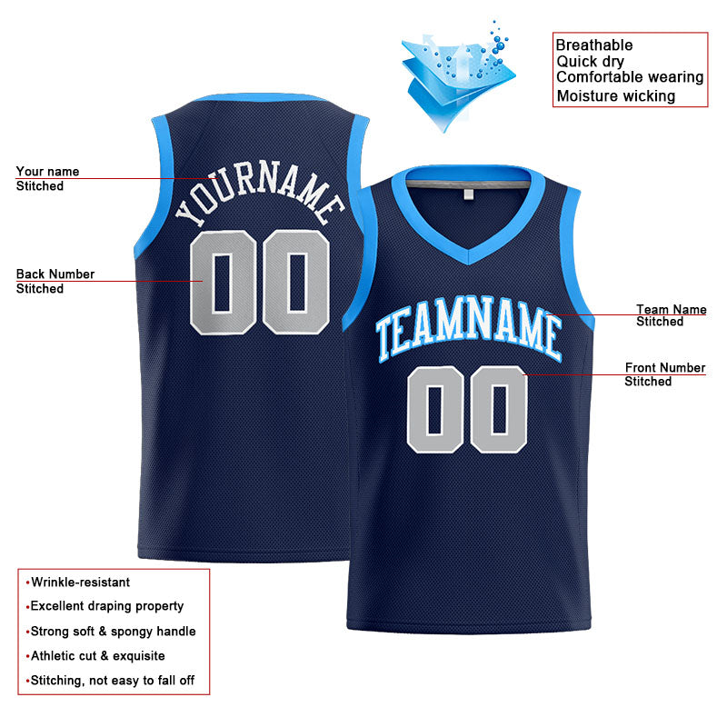 Benutzerdefinierte Authentisch  Basketball Trikot Marine-Weiß-Grau-Hellblau