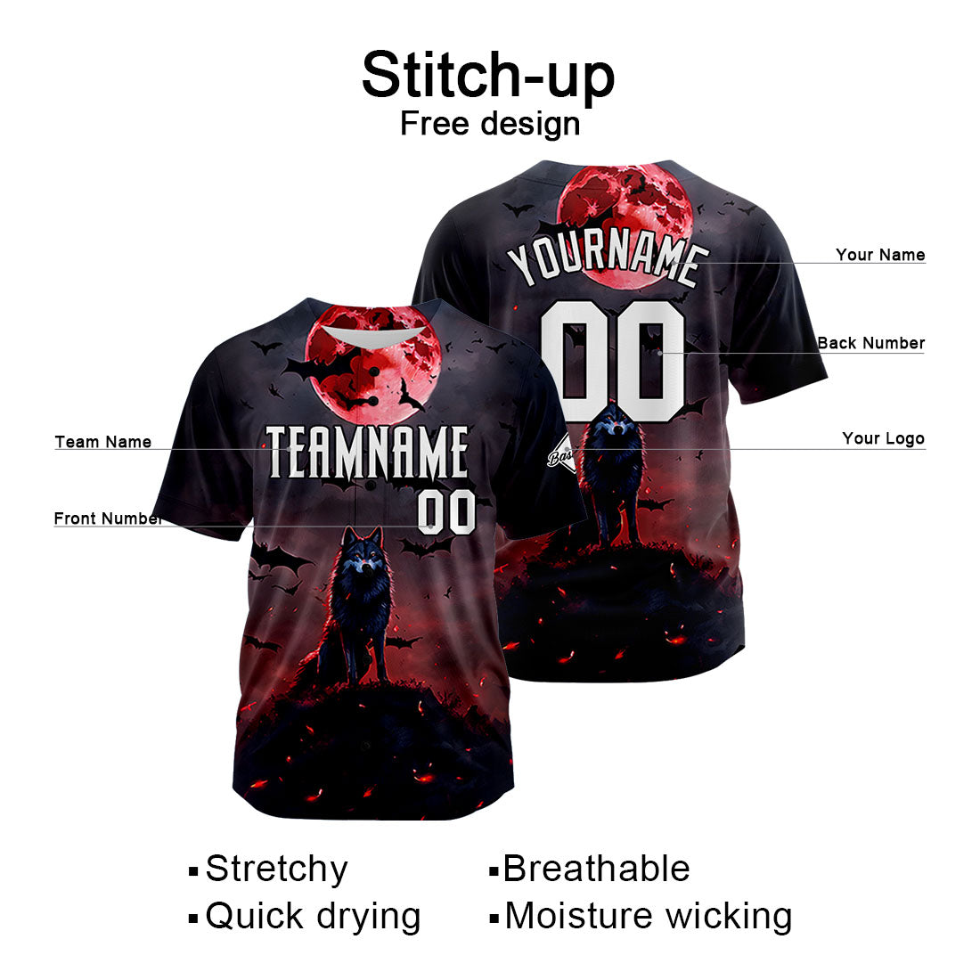 Benutzerdefinierte Baseball Jersey Personalisierte Baseball Shirt genäht und Druck Blutmond Wolf