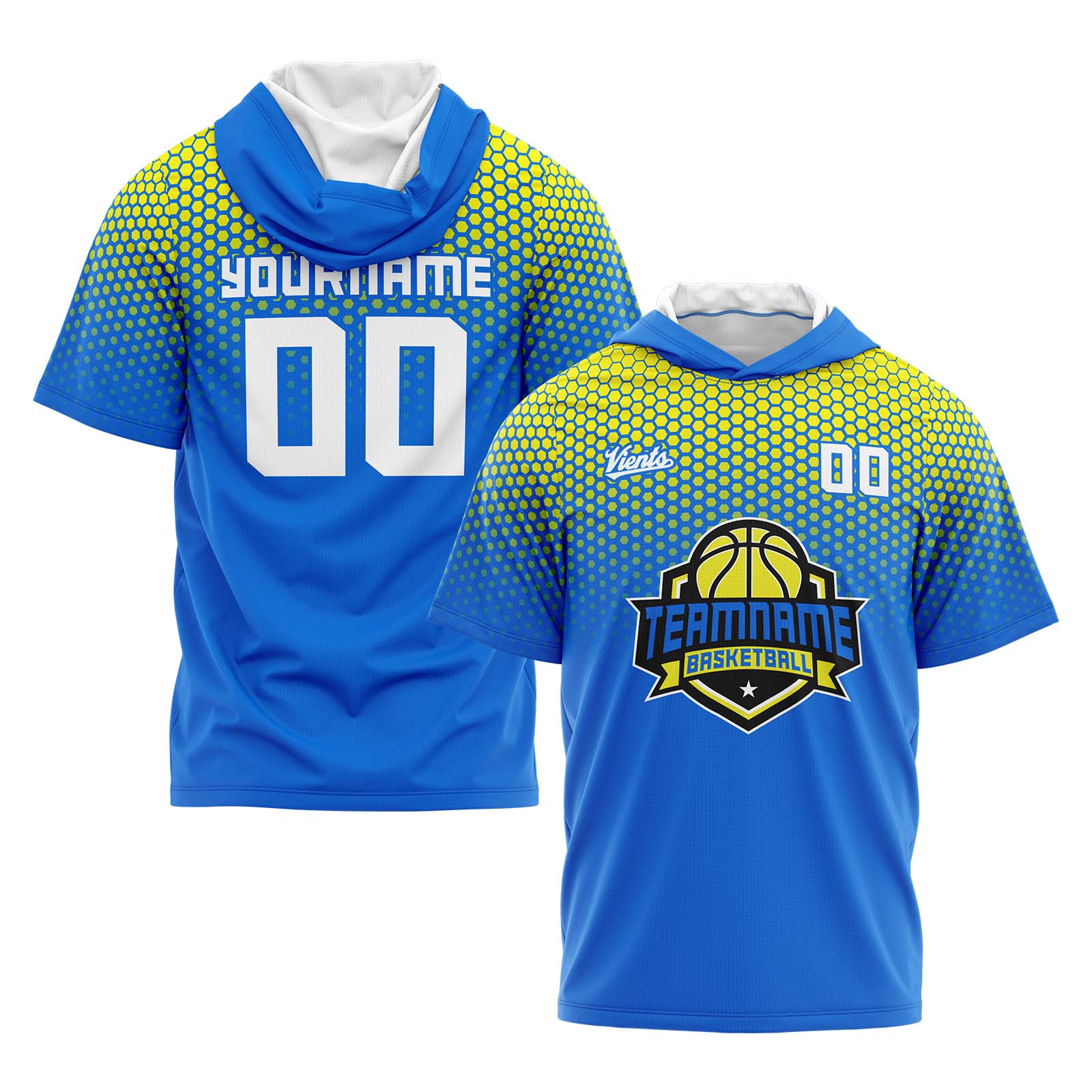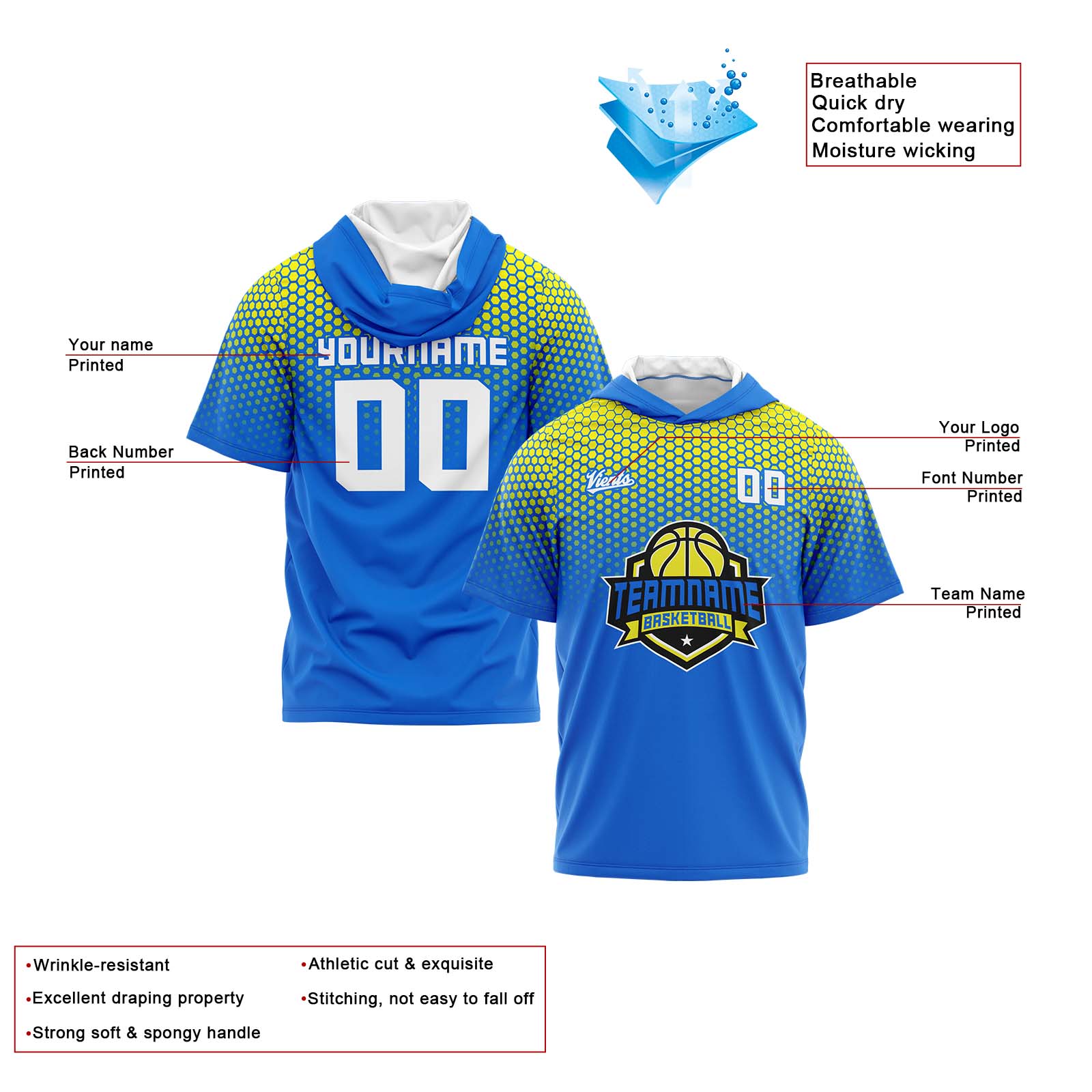Benutzerdefinierte Blau Gelb Kurzarm-Kapuzenpullover für Männer Frauen Hemden mit Kapuzen gedruckt Name Logo