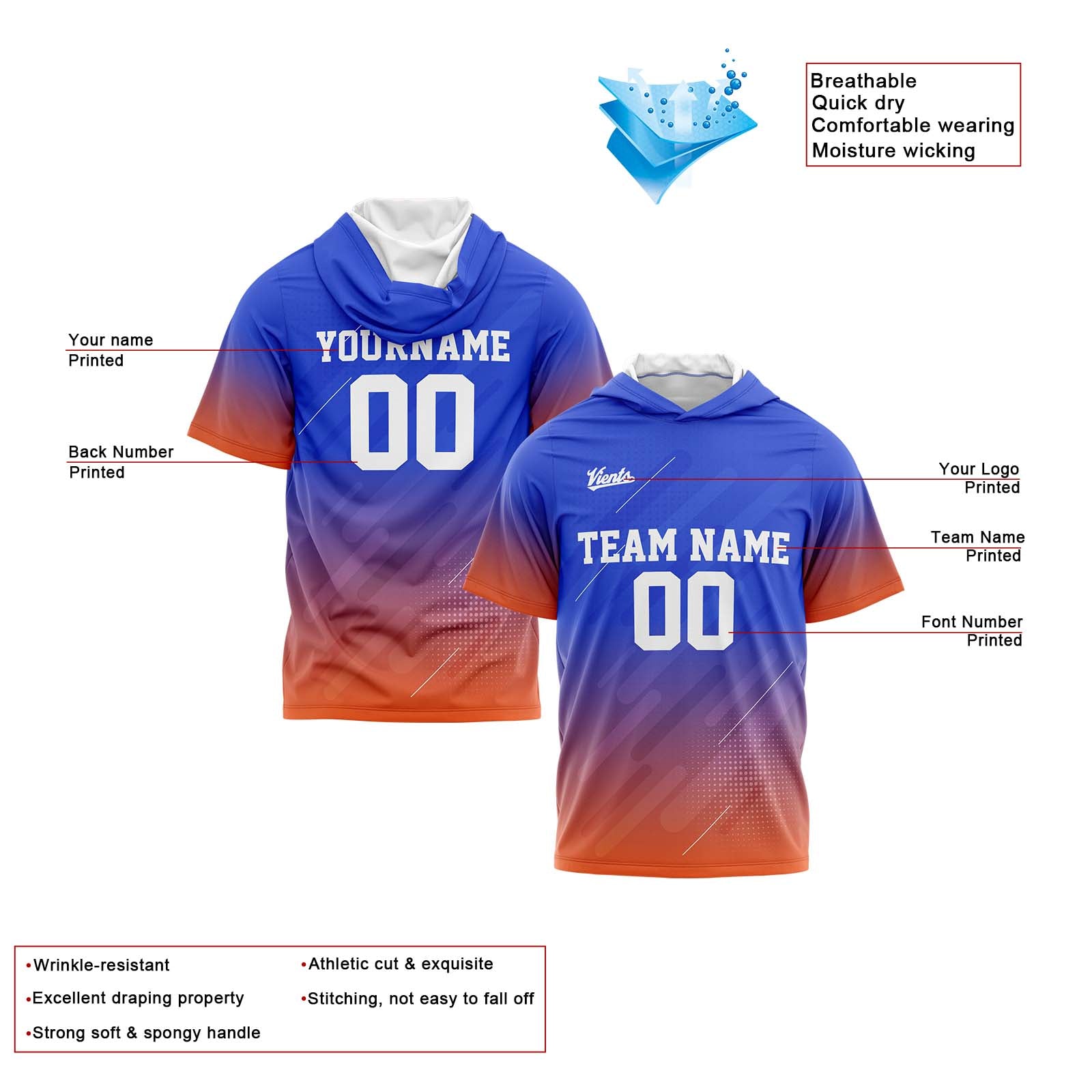 Benutzerdefinierte Blau Orange Kurzarm-Kapuzenpullover für Männer Frauen Hemden mit Kapuzen gedruckt Name Logo