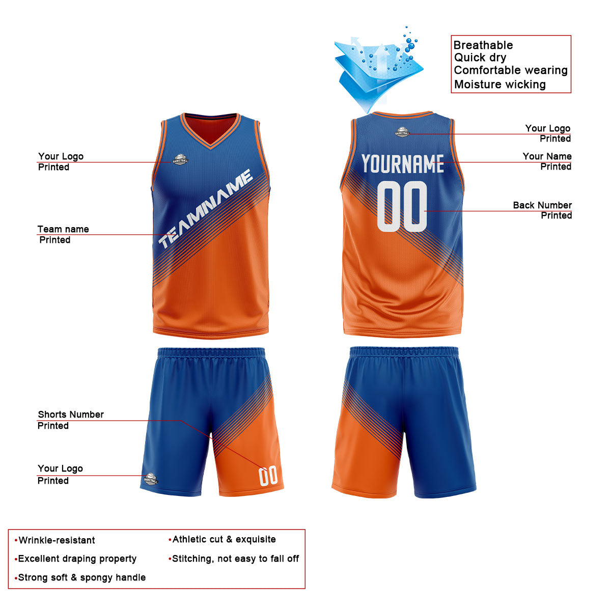 Benutzerdefinierte Blau Orange Reversible Basketball Jersey Personalisierte Print Name Nummer Logo