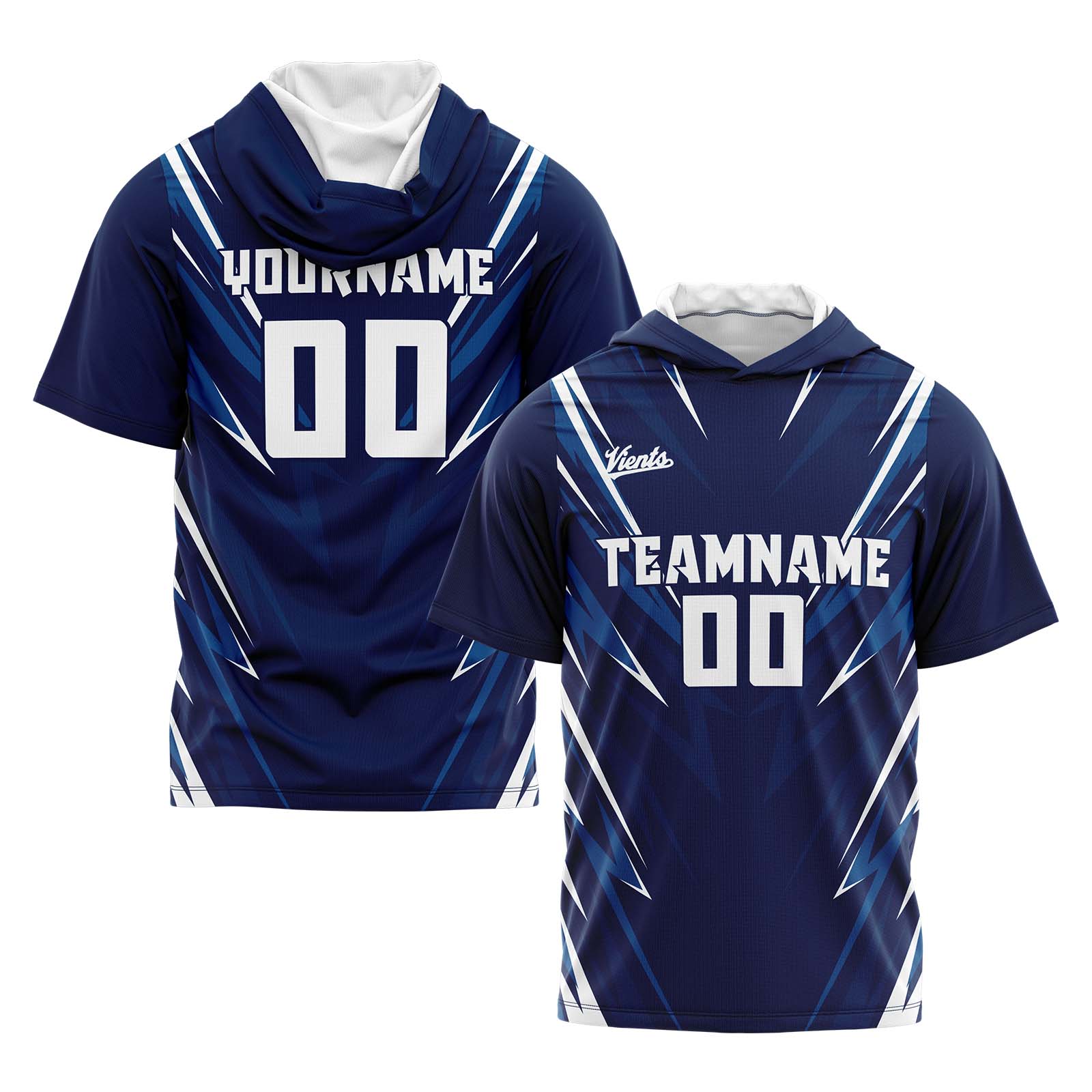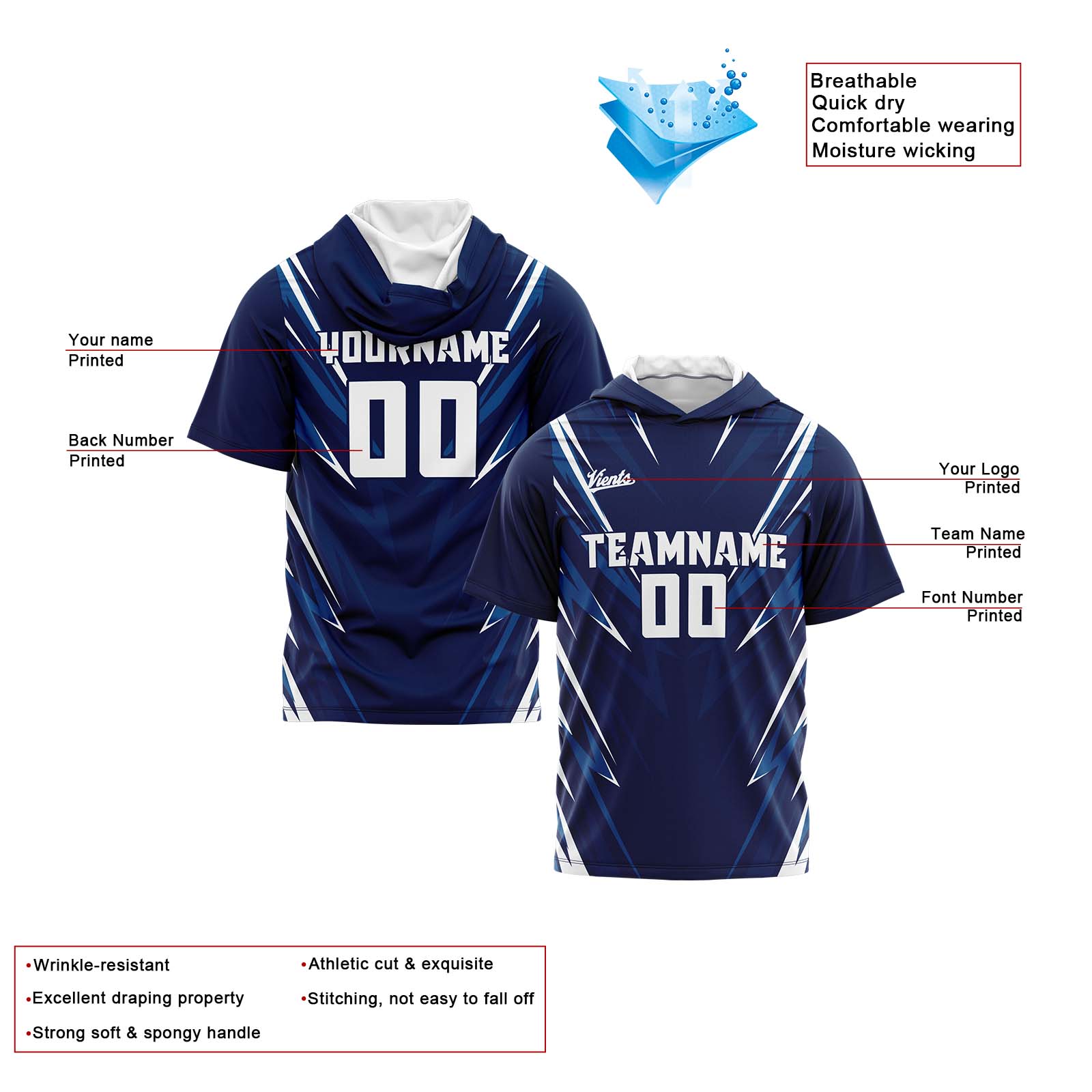 Benutzerdefinierte Dunkelblau Kurzarm-Kapuzenpullover für Männer Frauen Hemden mit Kapuzen gedruckt Name Logo