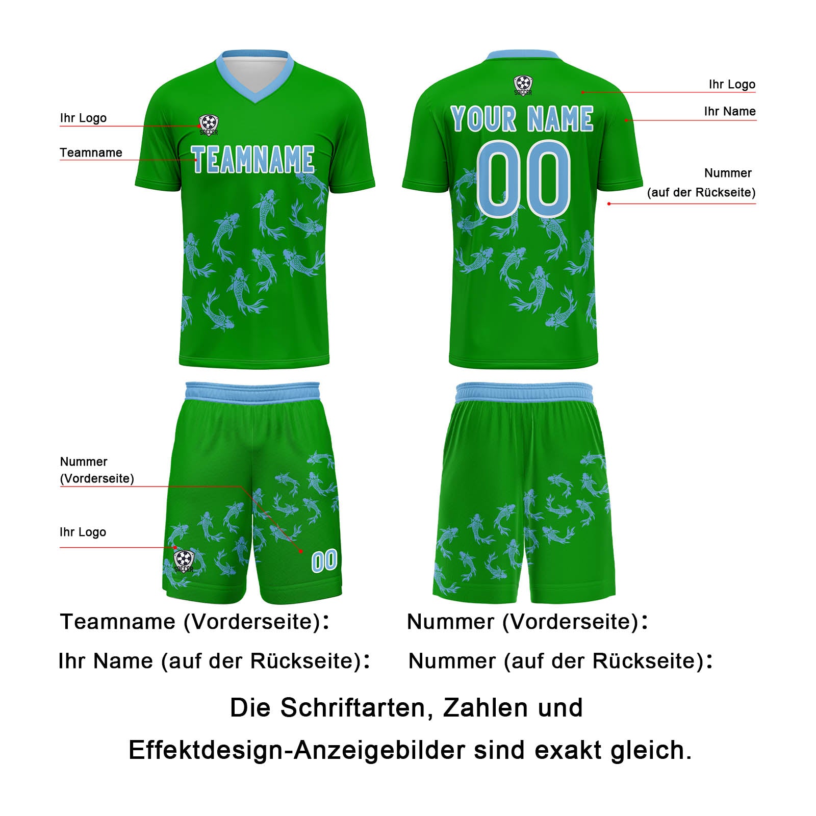 Fußball Set umfasst Shirts und Shorts. Bedruckt mit Name und Nummer, Logo.