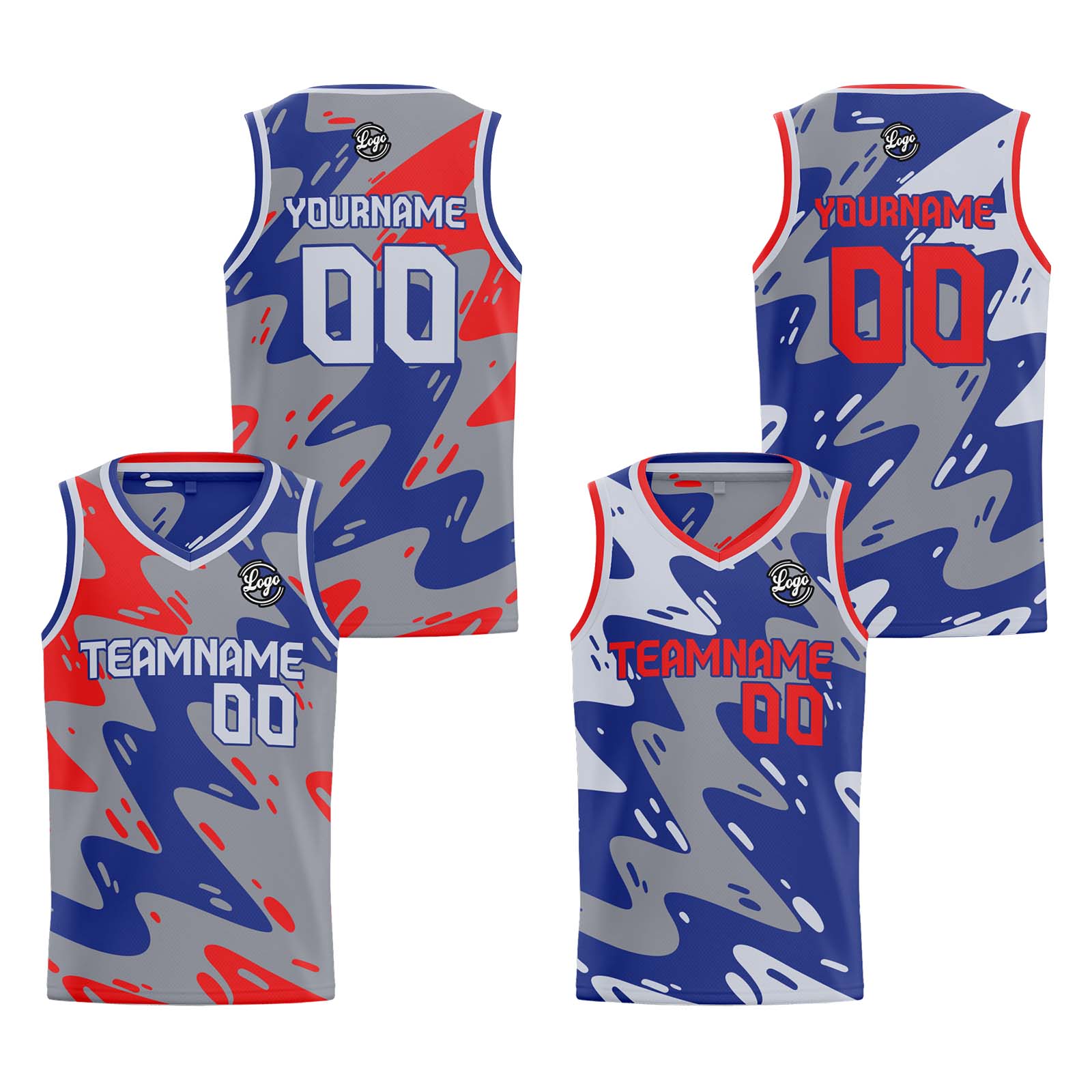 Benutzerdefinierte Grau Blau Rot Reversible Basketball Jersey Personalisierte Print Name Nummer Logo