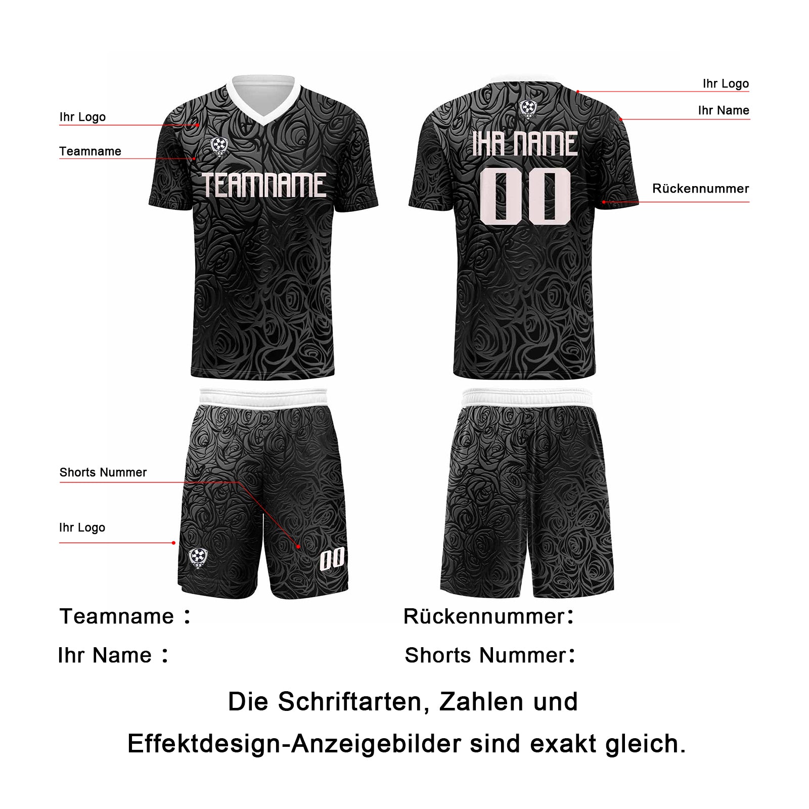 Fußball Set umfasst Shirts und Shorts. Bedruckt mit Name und Nummer, Logo.