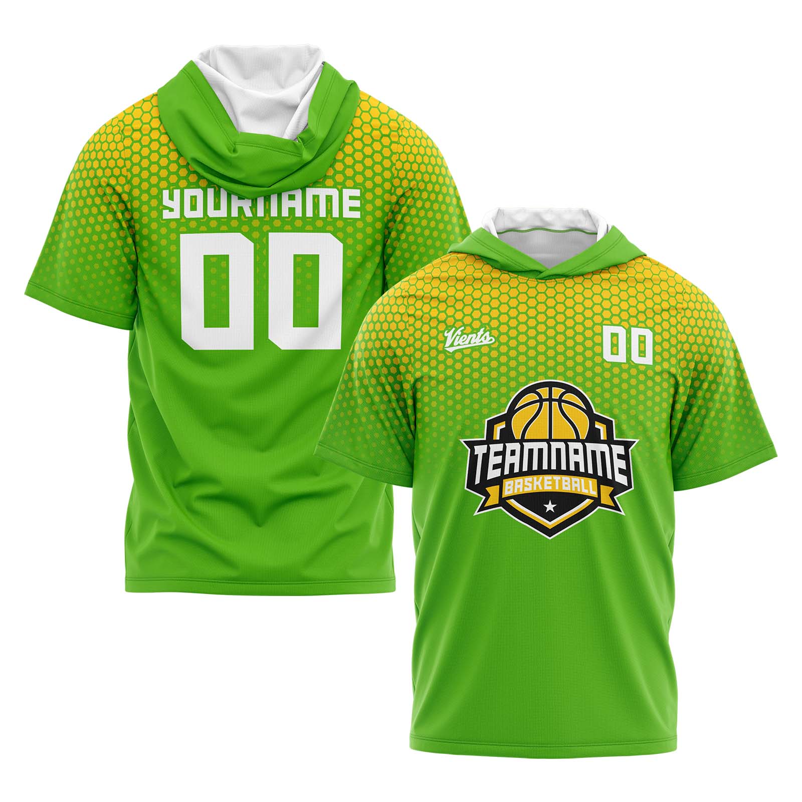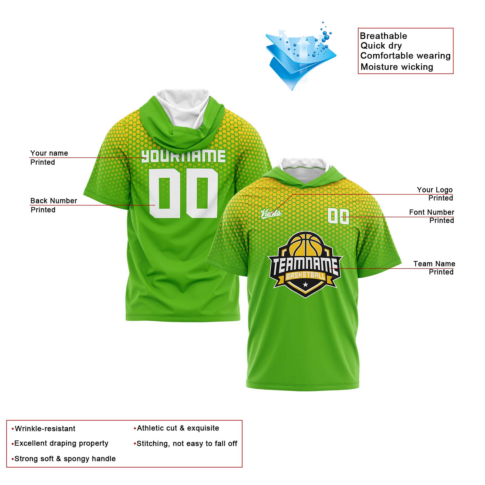 Benutzerdefinierte Grün Gelb Kurzarm-Kapuzenpullover für Männer Frauen Hemden mit Kapuzen gedruckt Name Logo