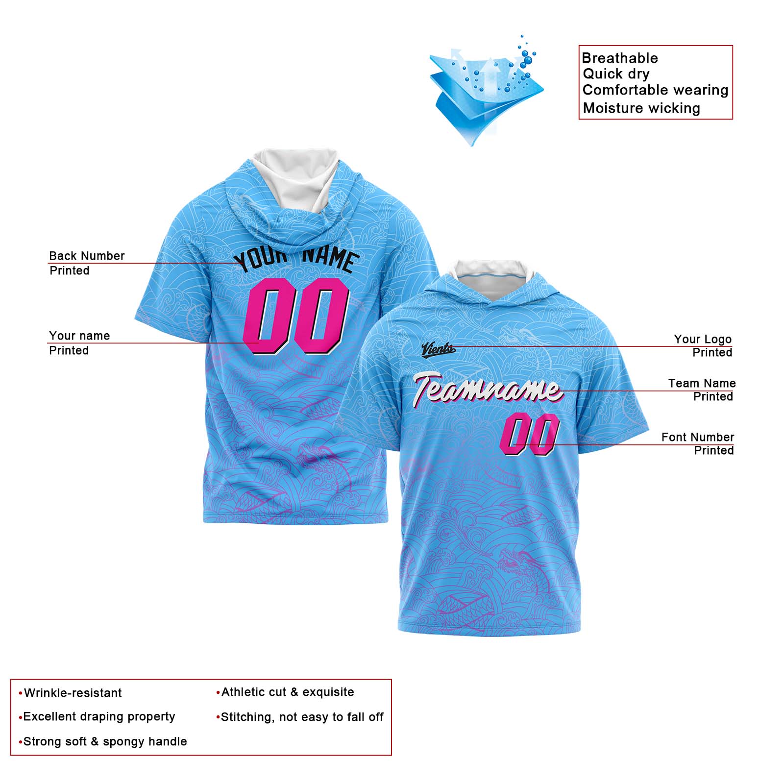 Benutzerdefinierte Hellblau Rosa Kurzarm-Kapuzenpullover für Männer Frauen Hemden mit Kapuzen gedruckt Name Logo