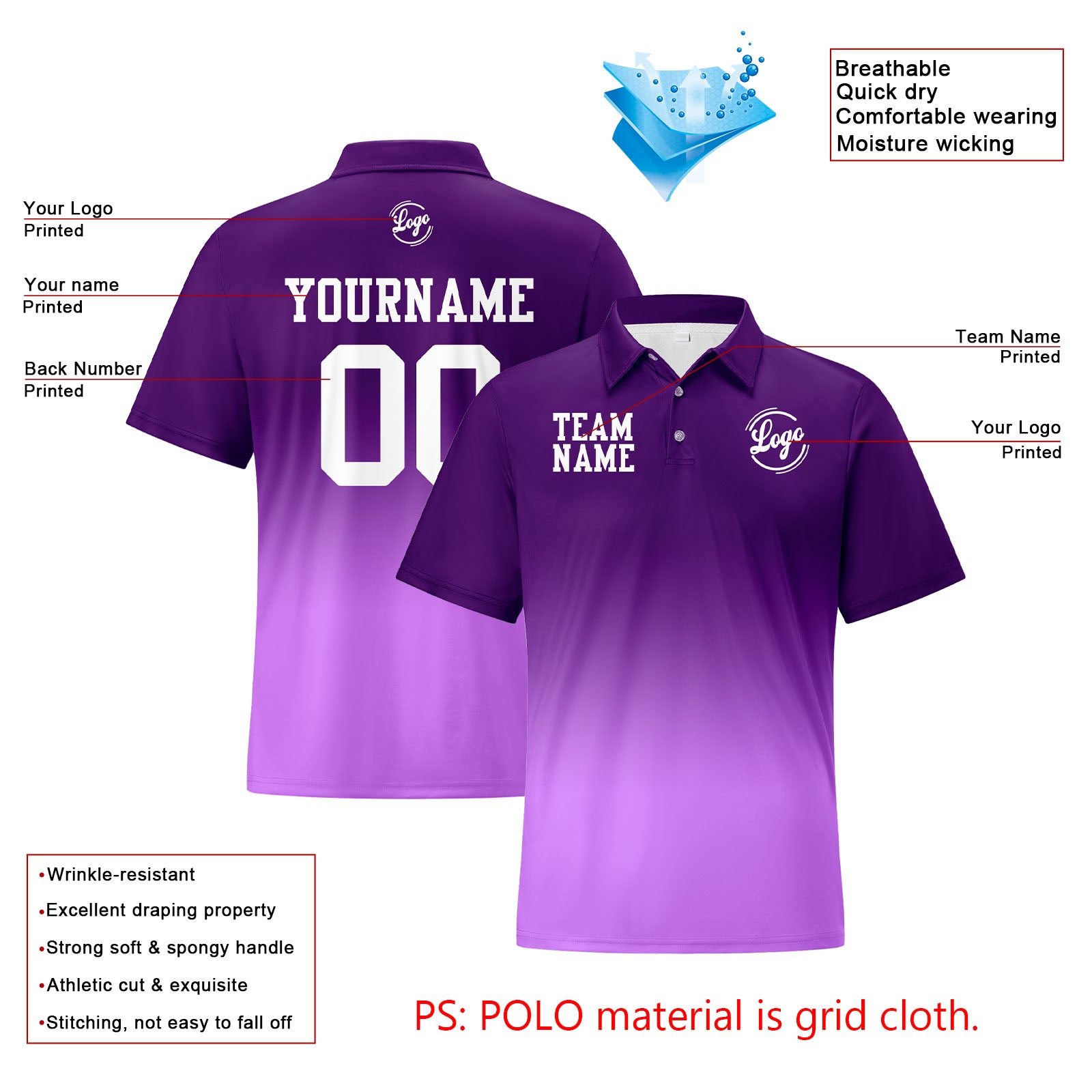 Benutzerdefinierte Lila Lichtlila Fußball Gradient Polo-Shirts Fügen Sie Ihr Einzigartiges hinzu Logo/Name/Nummer