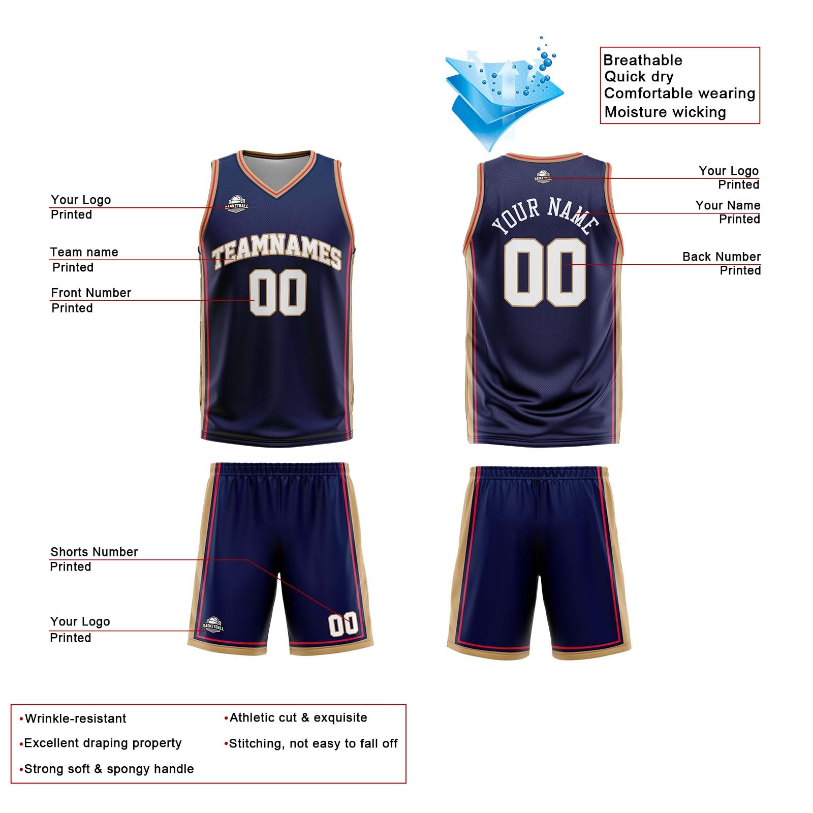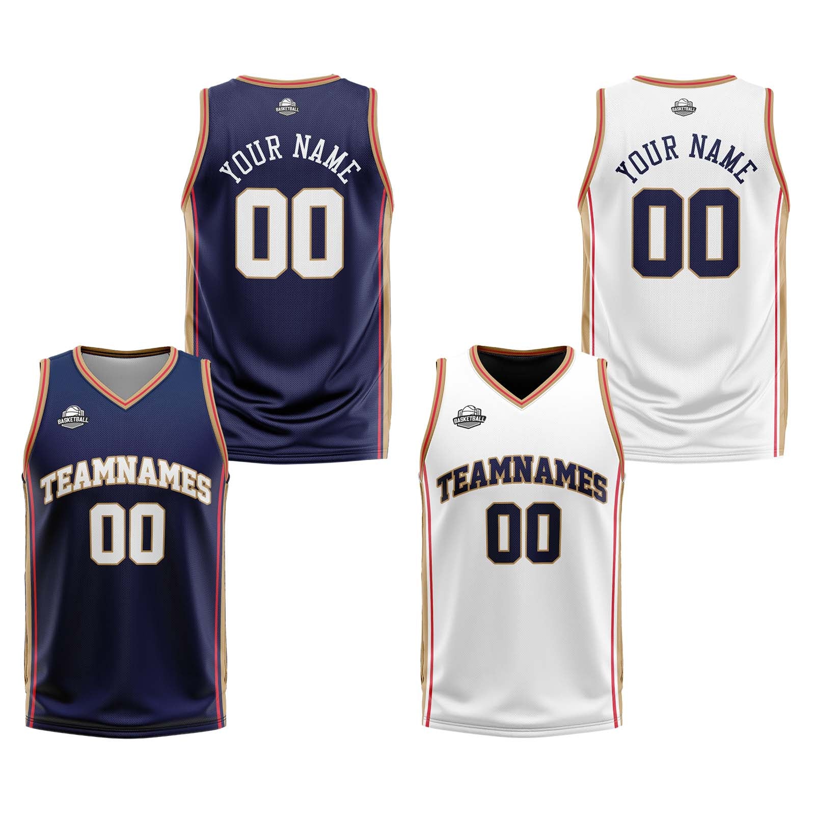 Benutzerdefinierte Marine Weiß Gold Reversible Basketball Jersey Personalisierte Print Name Nummer Logo