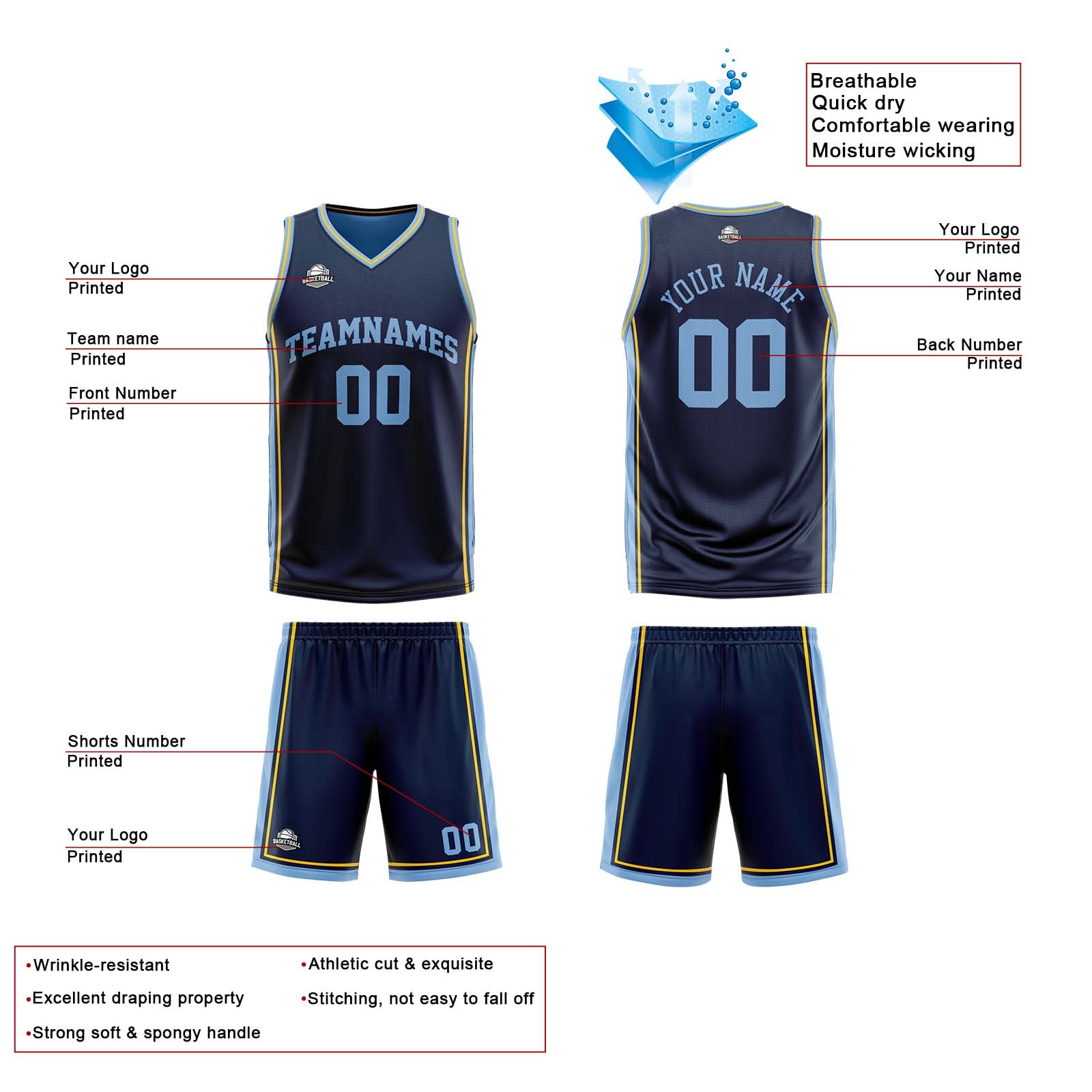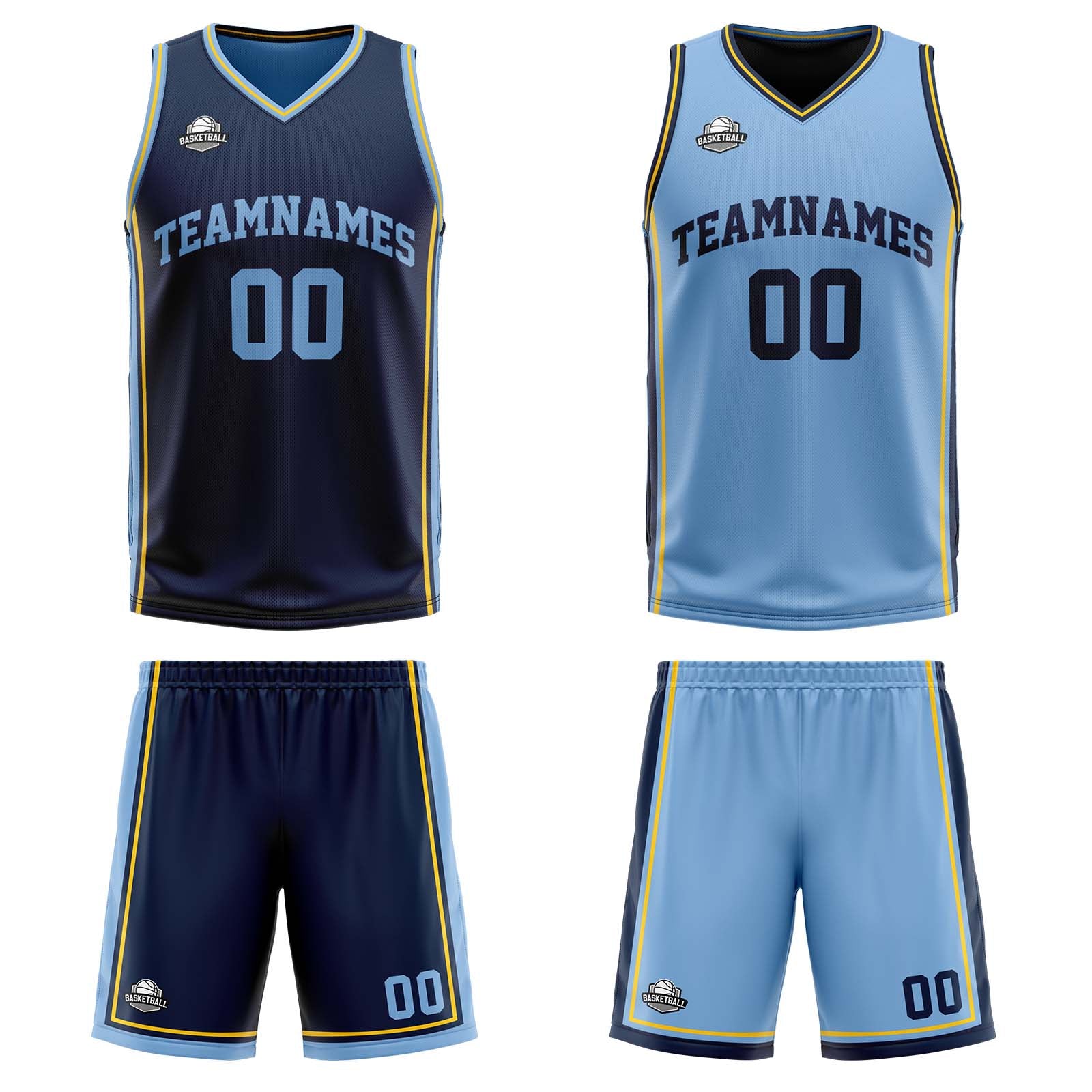 Benutzerdefinierte Marineblau Hellblau Gelb Reversible Basketball Jersey Personalisierte Print Name Nummer Logo