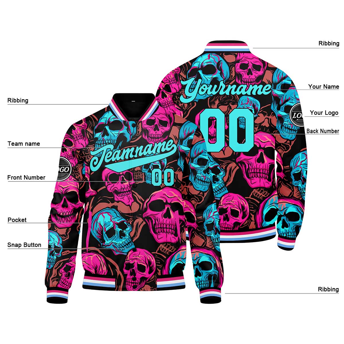 Diese Varsity-Jacke verfügt über einen personalisierten Letterman-Jacken-Stil mit gedrucktem Namen, Nummer und Logo.