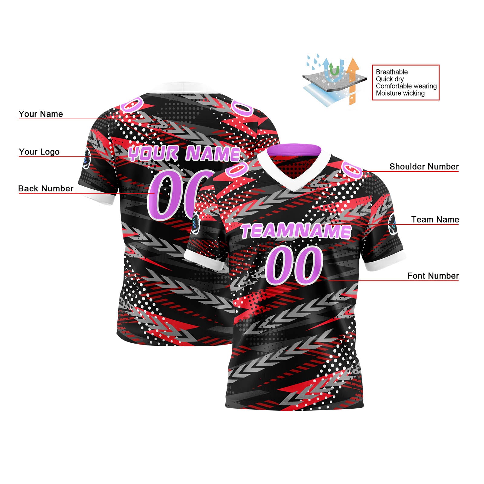 Premium Material: Unser maßgeschneidertes Fußballtrikot aus hochwertigem, atmungsaktivem Stoff sorgt dafür, dass Sie während intensiver Spiele und Trainingseinheiten kühl und komfortabel bleiben.