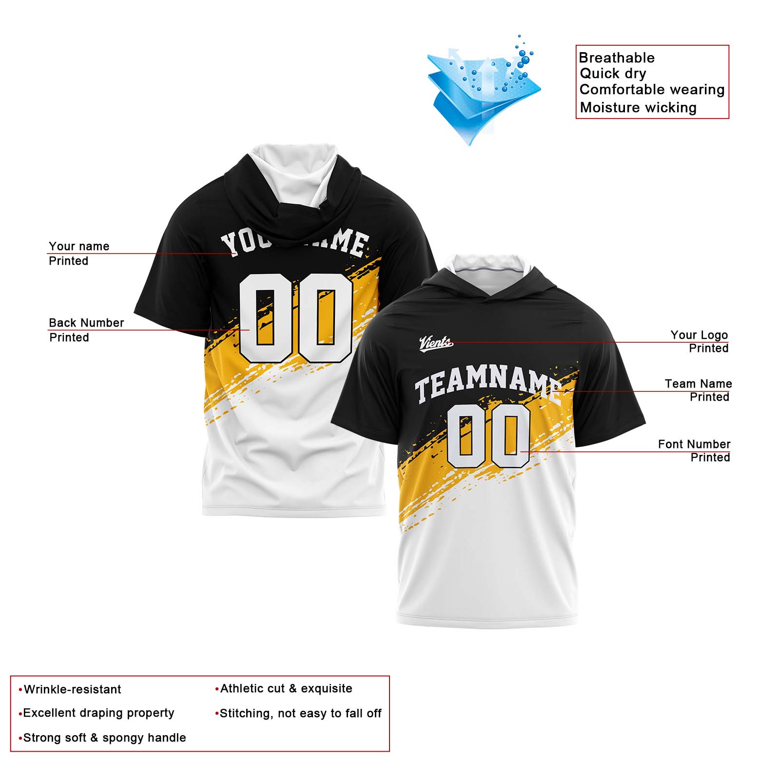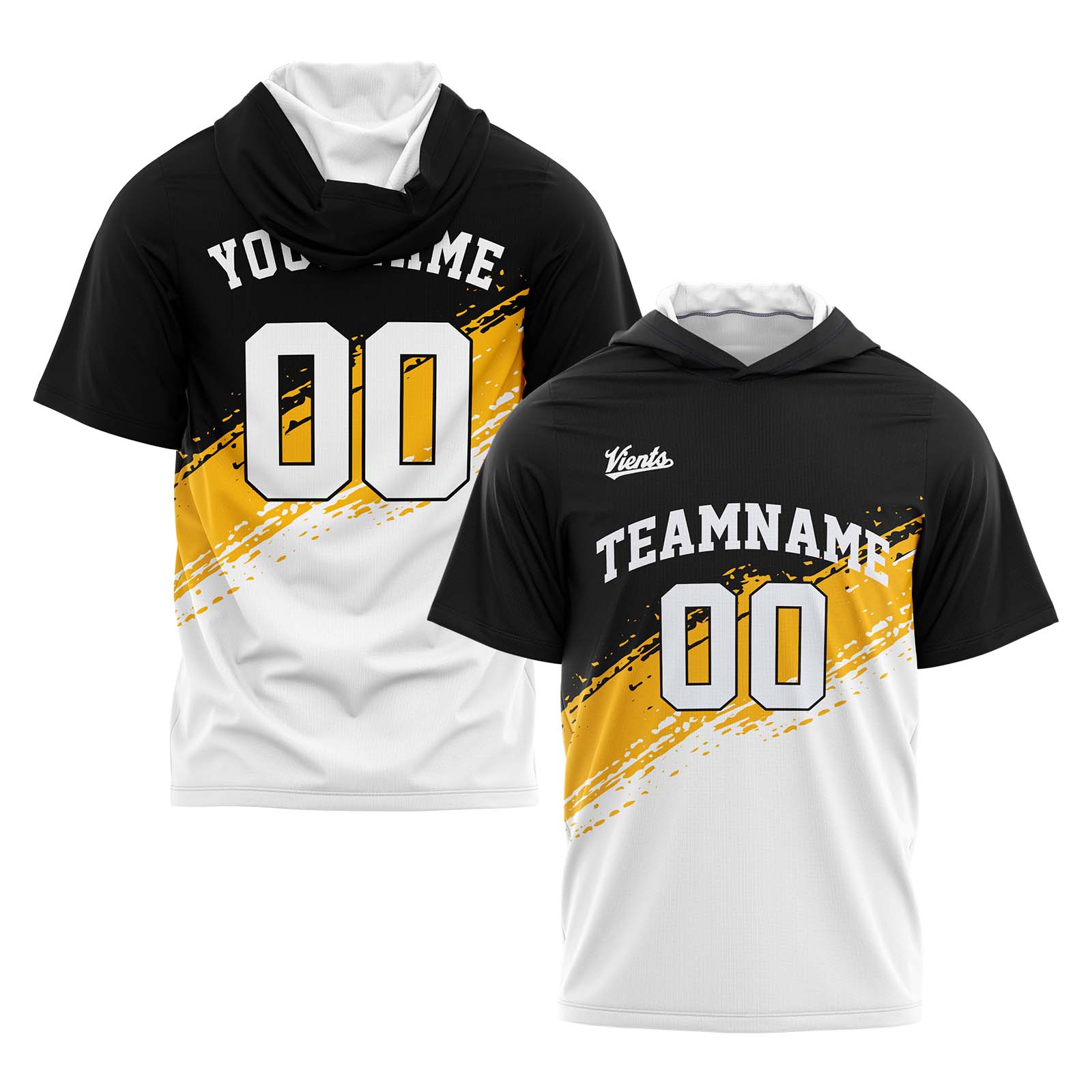 Benutzerdefinierte Schwarz Gelb Weiß Kurzarm-Kapuzenpullover für Männer Frauen Hemden mit Kapuzen gedruckt Name Logo
