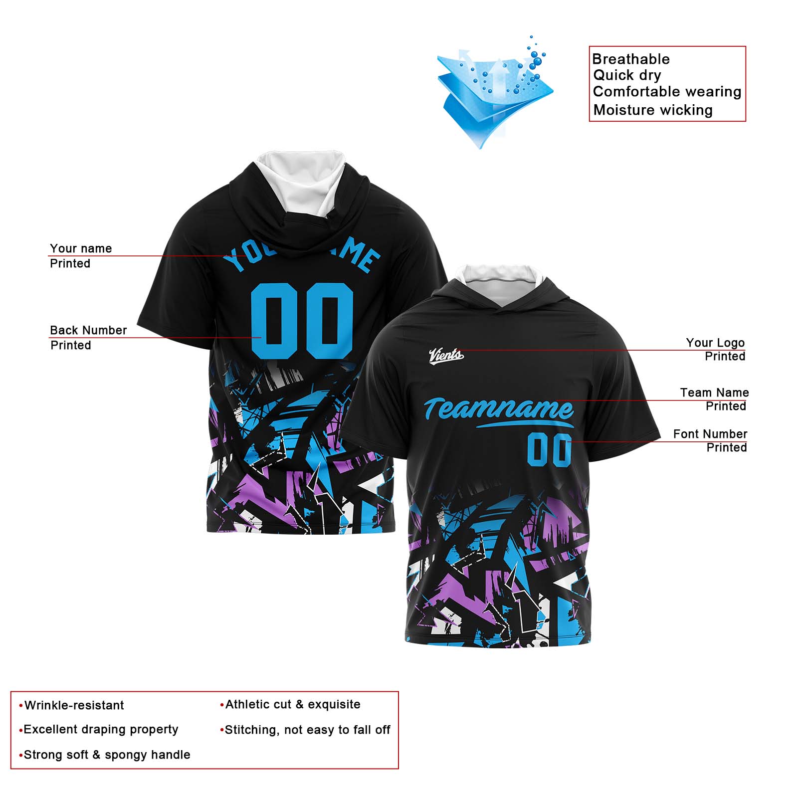 Benutzerdefinierte Schwarz Hellblau Kurzarm-Kapuzenpullover für Männer Frauen Hemden mit Kapuzen gedruckt Name Logo