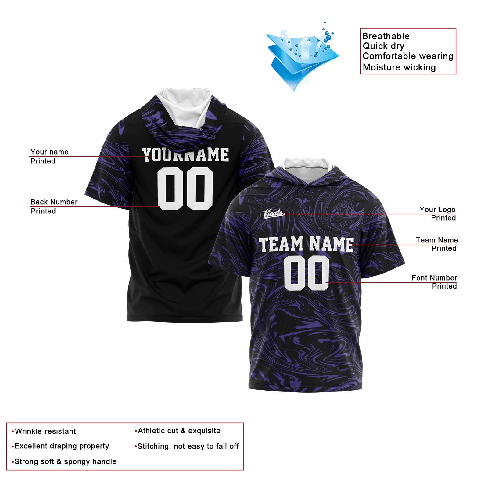Benutzerdefinierte Schwarz Lila Kurzarm-Kapuzenpullover für Männer Frauen Hemden mit Kapuzen gedruckt Name Logo