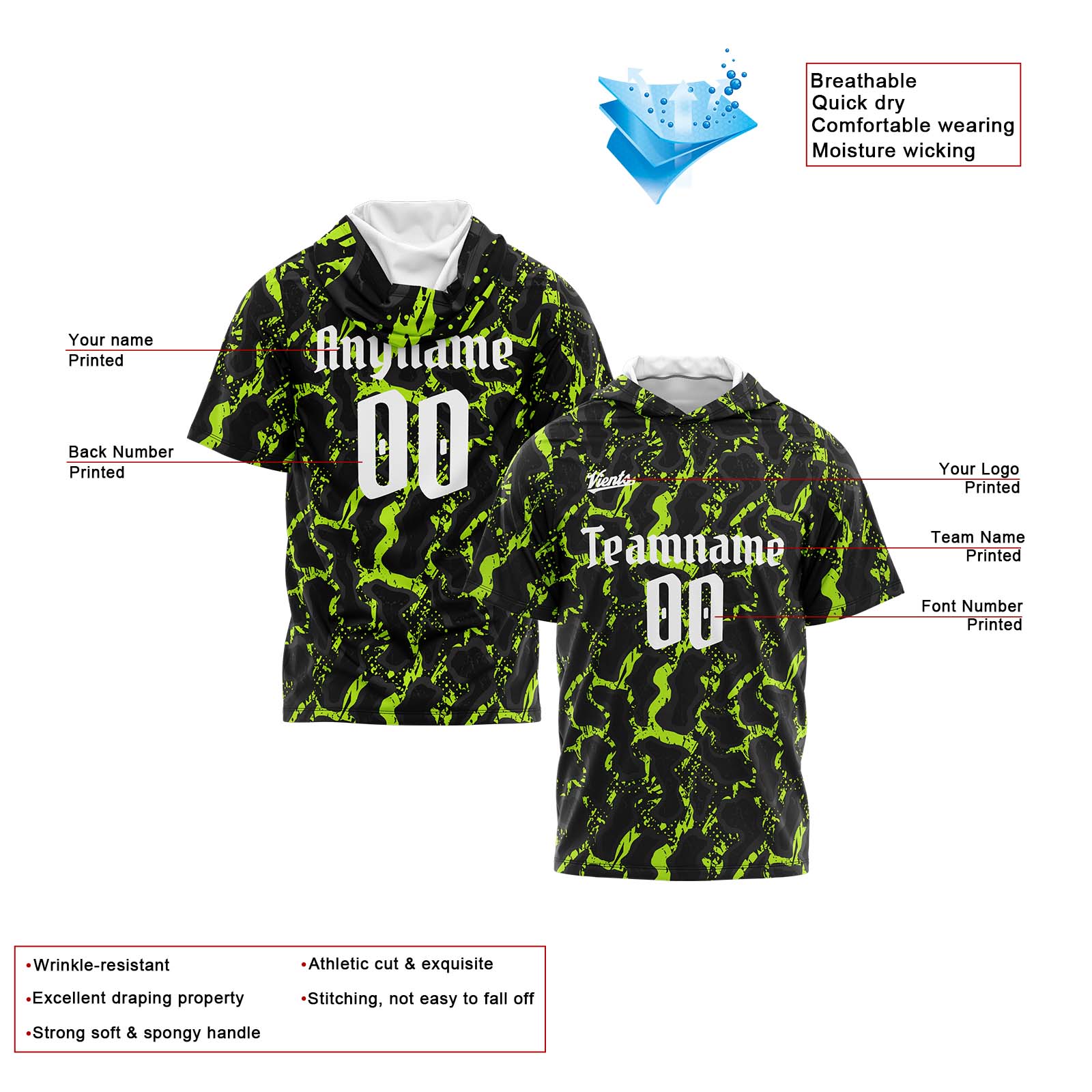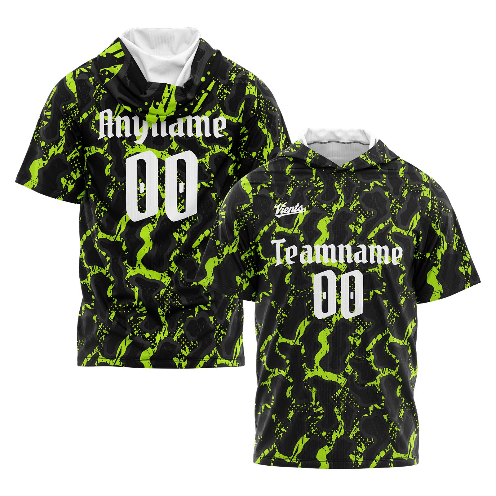 Benutzerdefinierte Schwarz Neon Grün Kurzarm-Kapuzenpullover für Männer Frauen Hemden mit Kapuzen gedruckt Name Logo