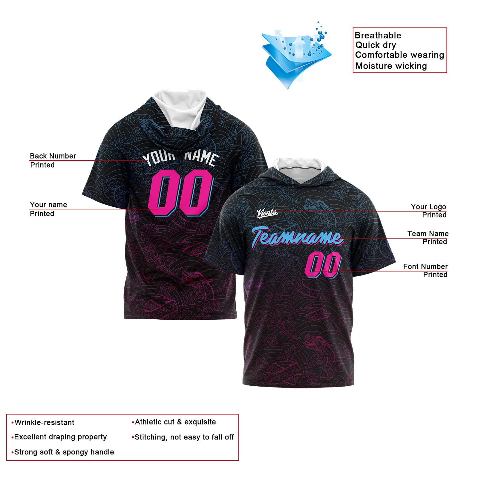 Benutzerdefinierte Schwarz Rosa Hellblau Kurzarm-Kapuzenpullover für Männer Frauen Hemden mit Kapuzen gedruckt Name Logo