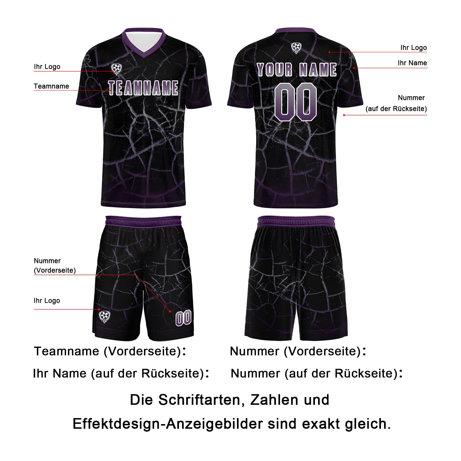 Fußball Set umfasst Shirts und Shorts. Bedruckt mit Name und Nummer, Logo.