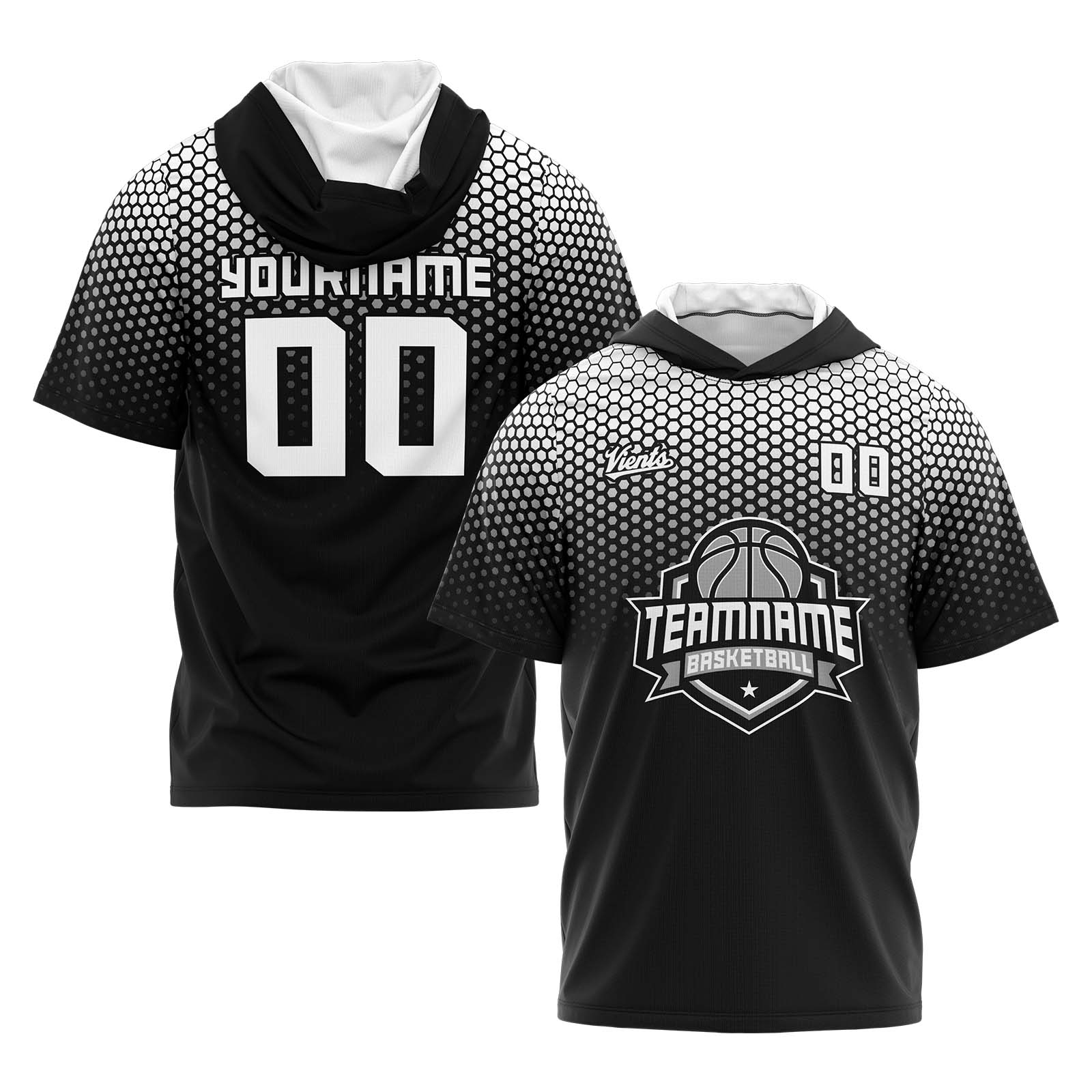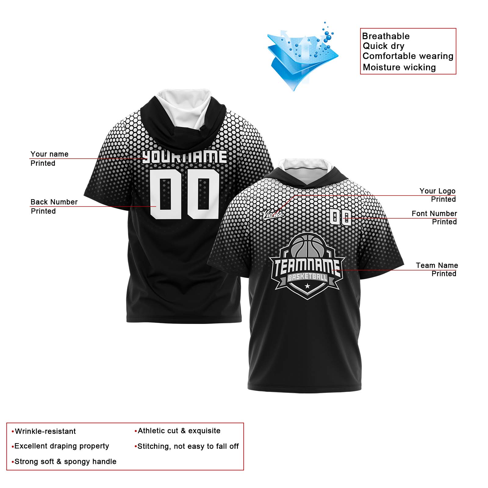 Benutzerdefinierte Schwarz Weiß Kurzarm-Kapuzenpullover für Männer Frauen Hemden mit Kapuzen gedruckt Name Logo