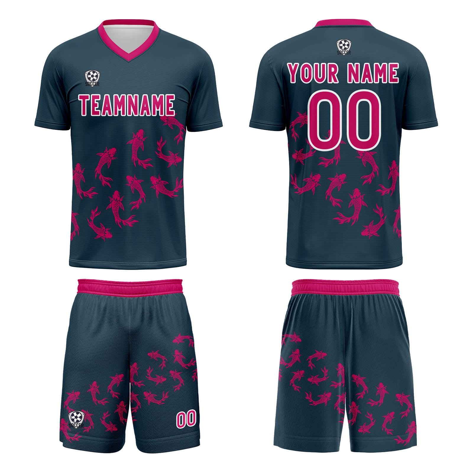 Fußball Set umfasst Shirts und Shorts. Bedruckt mit Name und Nummer, Logo.