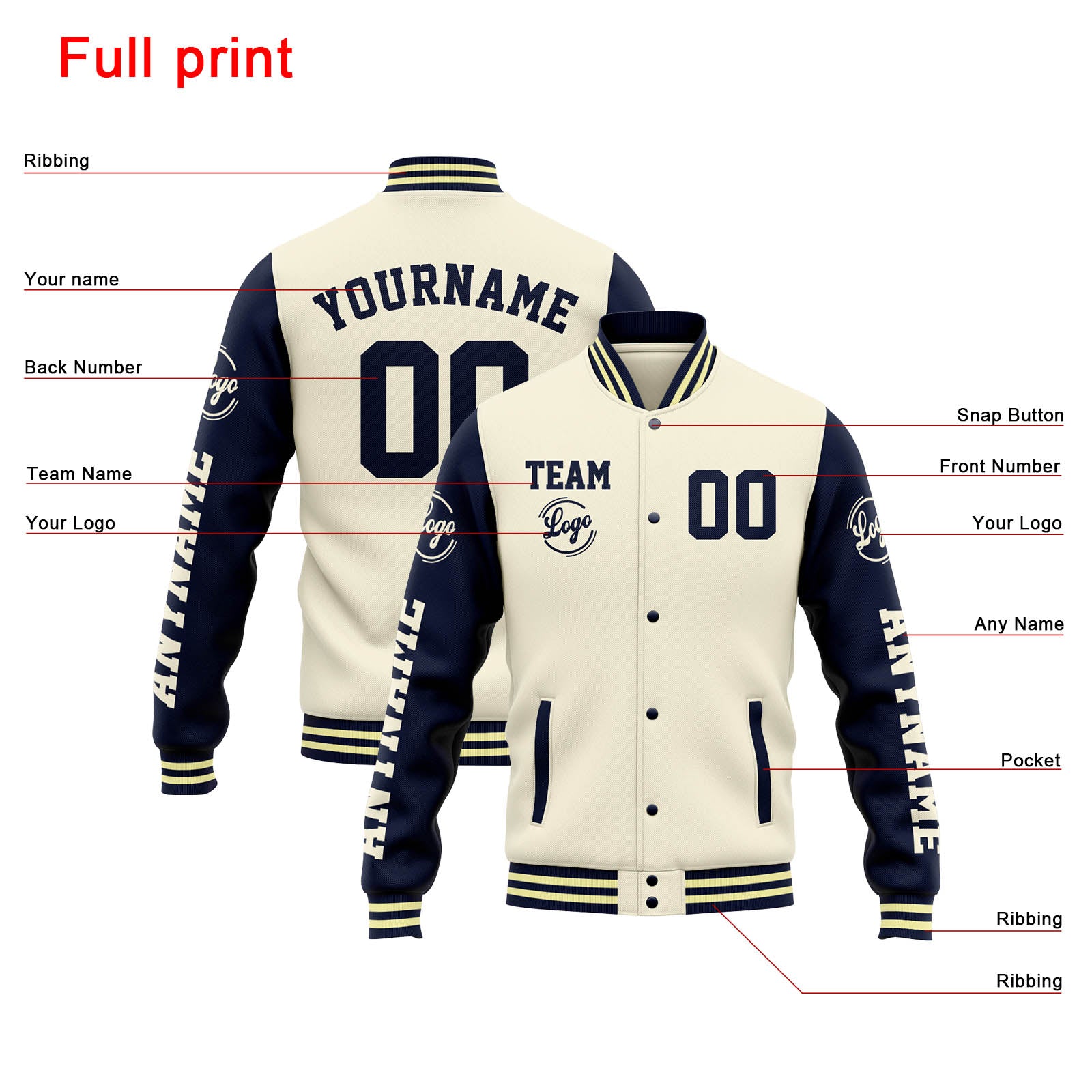 Benutzerdefinierte Varsity-Jacke. Letterman-Jacke für Männer, Frauen und Jugendliche Creme Marine