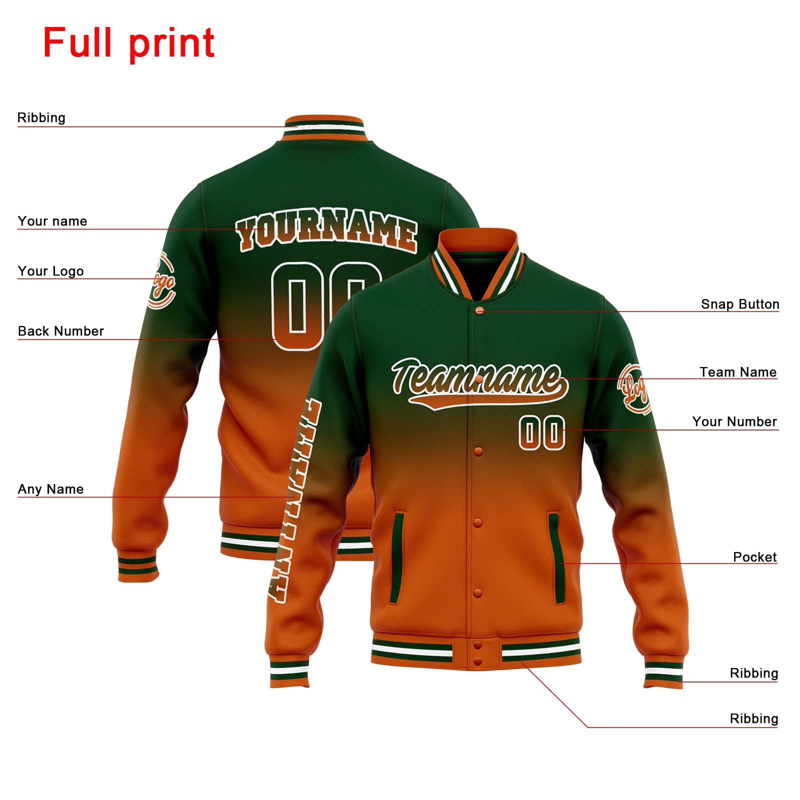 Benutzerdefinierte Varsity-Jacke. Letterman-Jacke für Männer, Frauen und Jugendliche Drak Grün Orange Verlauf
