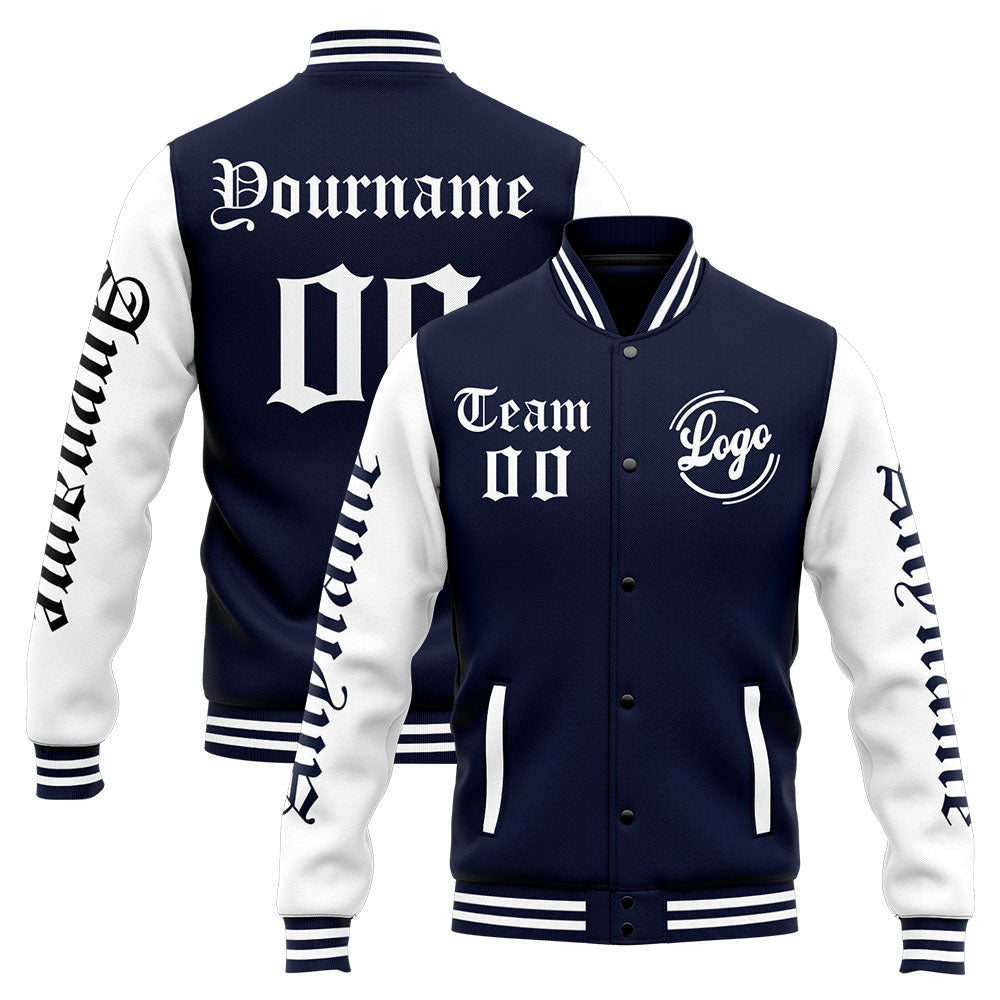 Benutzerdefinierte Varsity-Jacke. Letterman-Jacke für Männer, Frauen und Jugendliche Marine Weiß