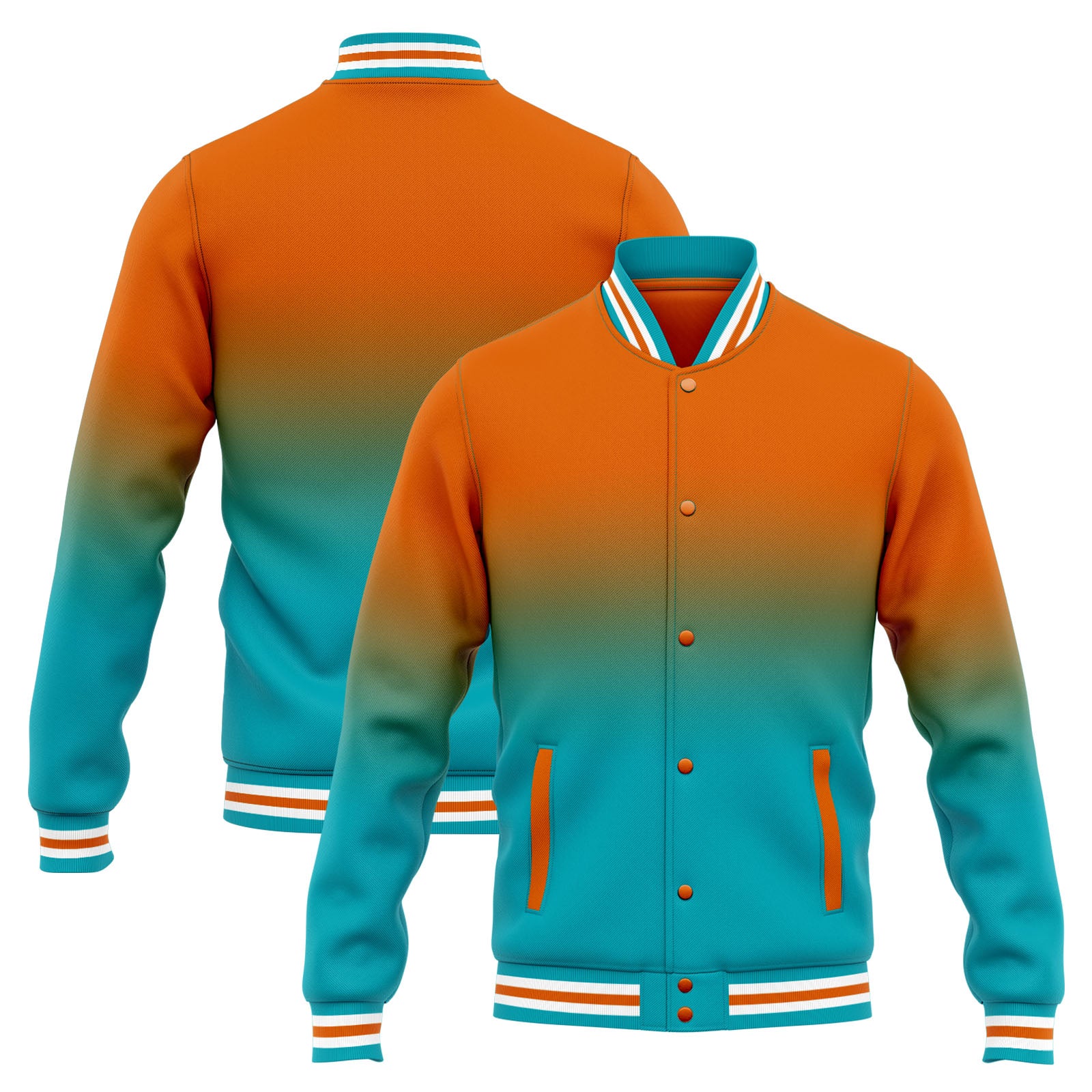 Benutzerdefinierte Varsity-Jacke. Letterman-Jacke für Männer, Frauen und Jugendliche Orange Teal Verlauf