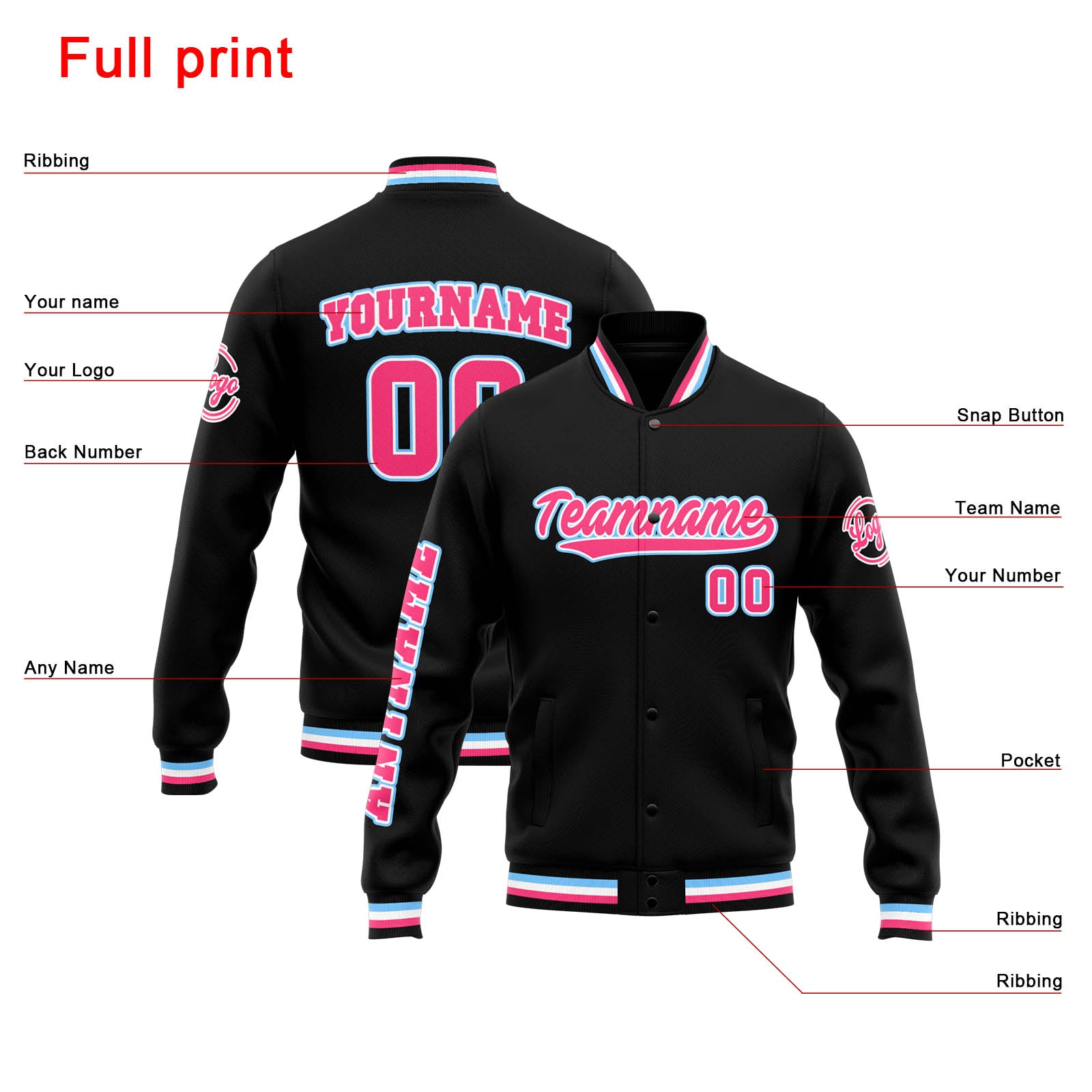 Benutzerdefinierte Varsity-Jacke. Letterman-Jacke für Männer, Frauen und Jugendliche Schwarz Rosa