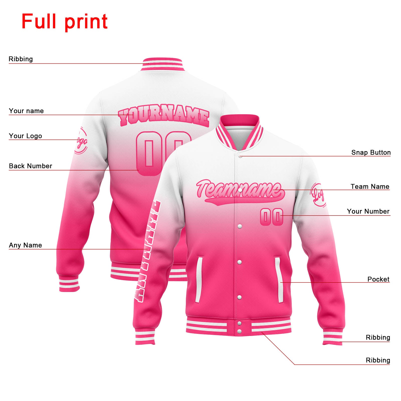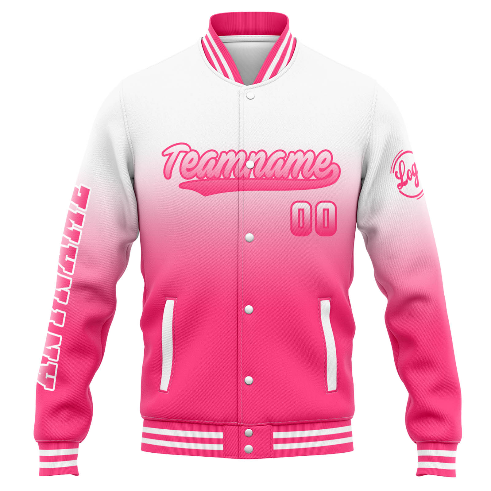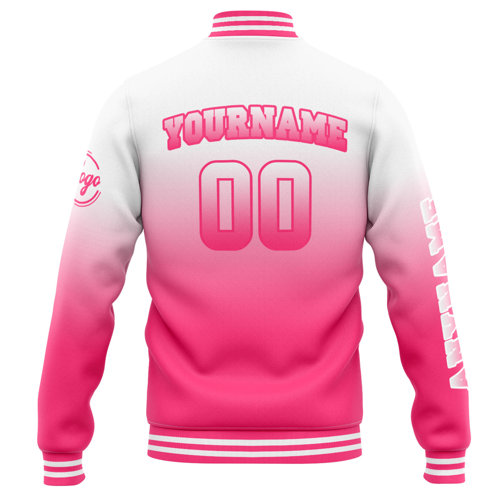 Benutzerdefinierte Varsity-Jacke. Letterman-Jacke für Männer, Frauen und Jugendliche Weiß Rosa Verlauf