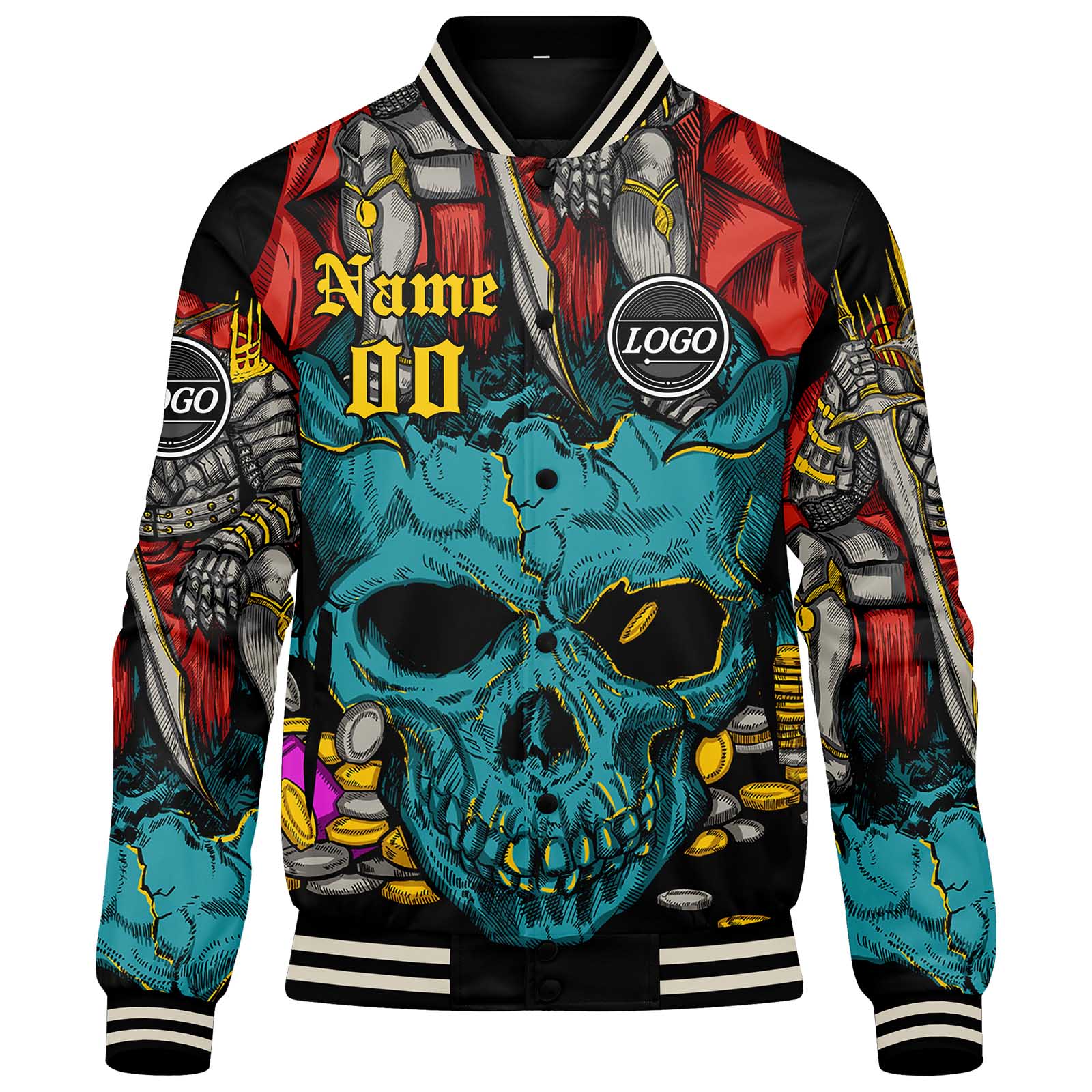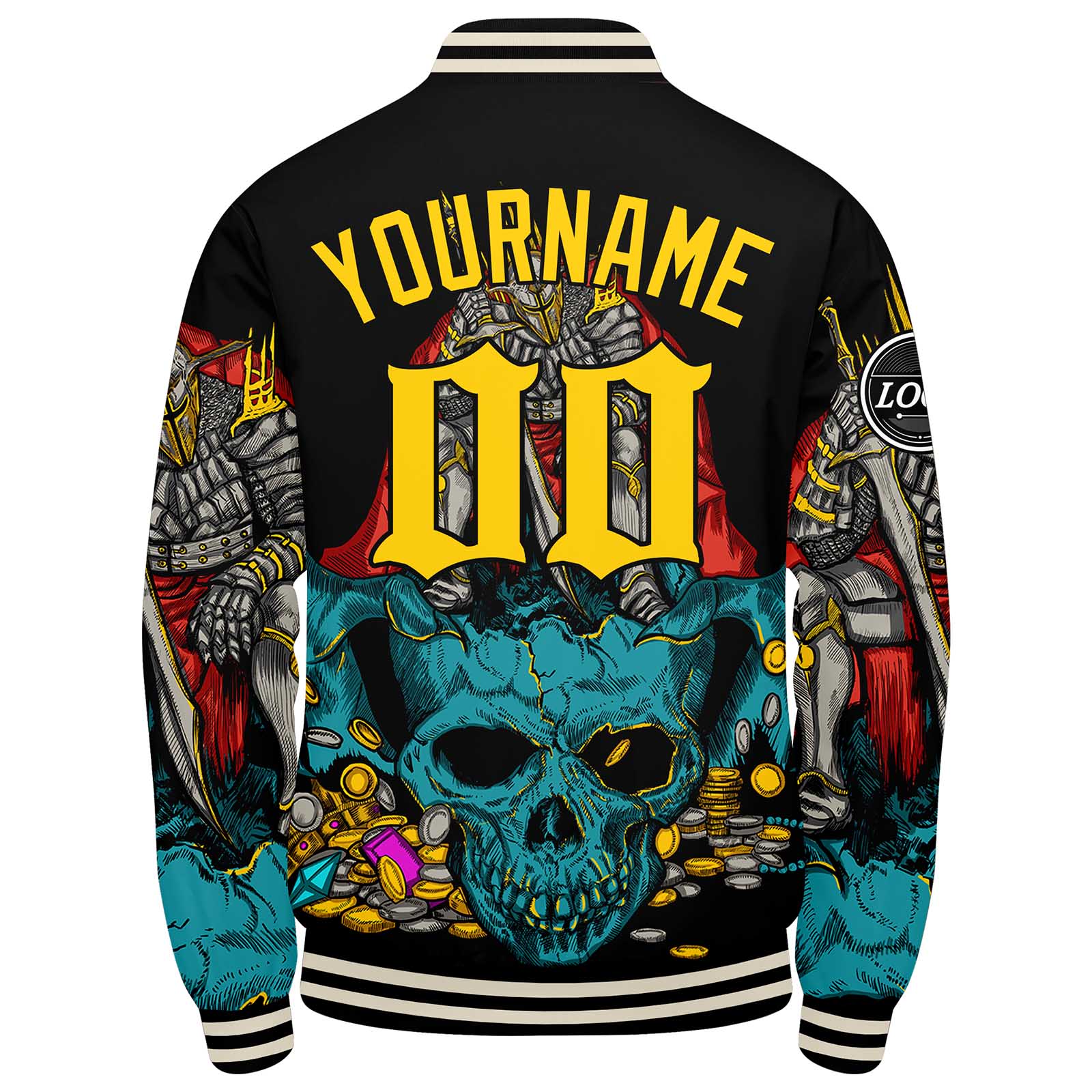 Diese Varsity-Jacke verfügt über einen personalisierten Letterman-Jacken-Stil mit genäht Namen, Nummer und Logo.