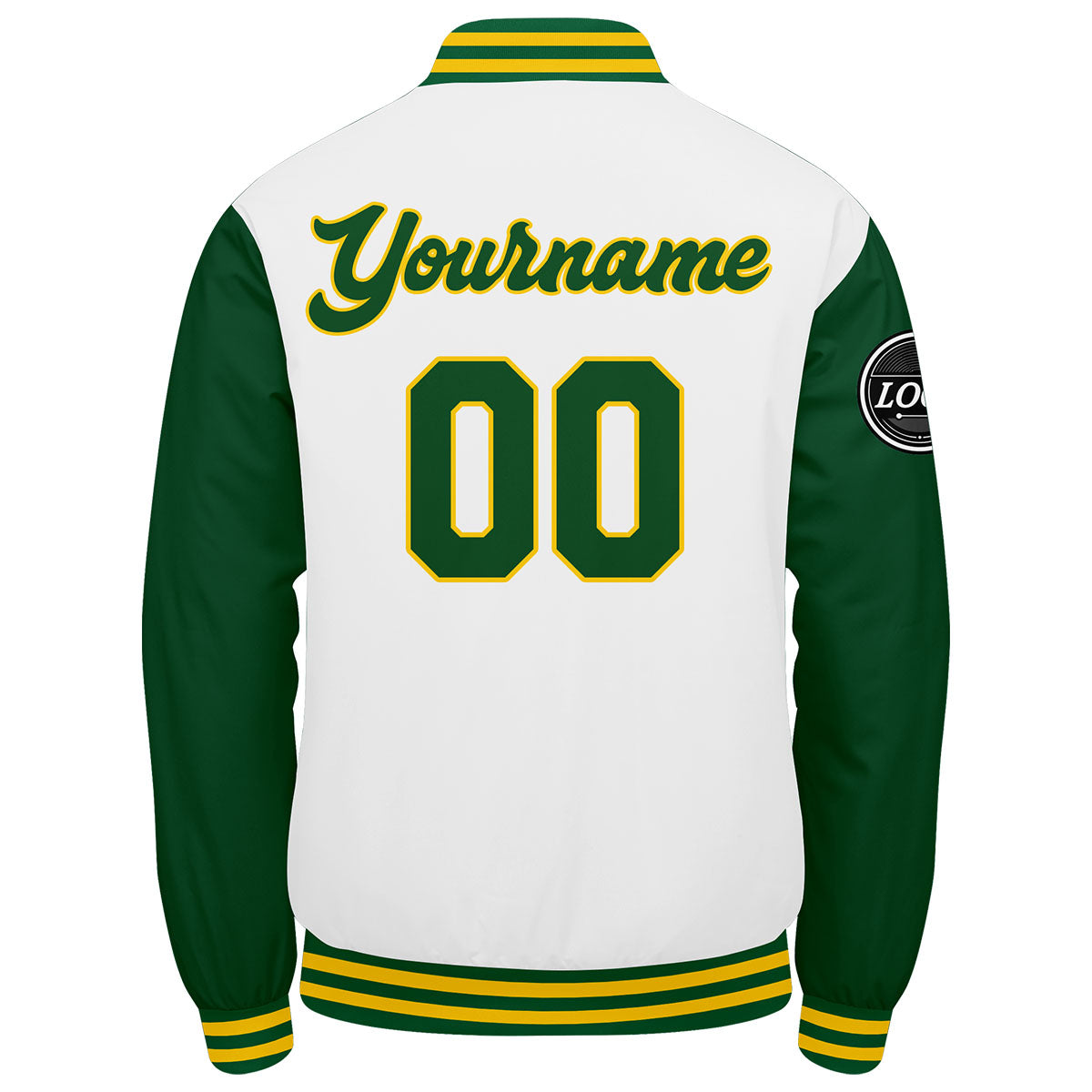 Diese Varsity-Jacke verfügt über einen personalisierten Letterman-Jacken-Stil mit genäht Namen, Nummer und Logo.
