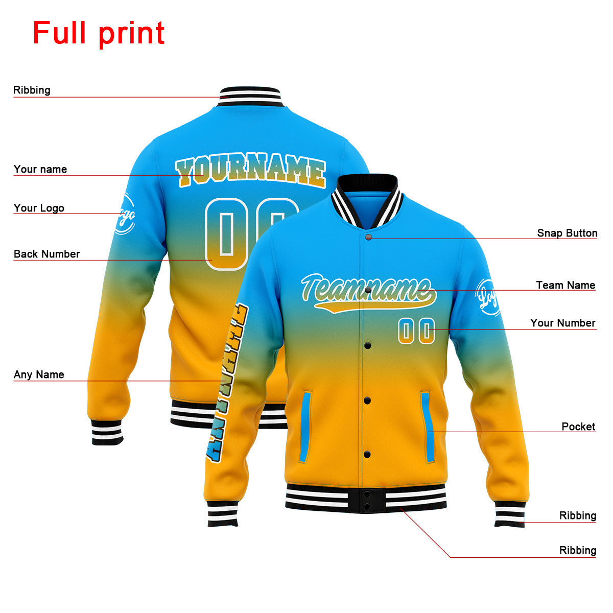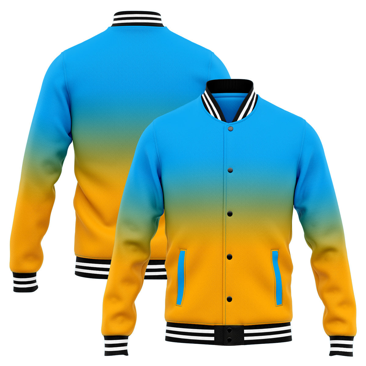 Benutzerdefinierte Verlauf Varsity-Jacke. Letterman-Jacke Hellblau Orange