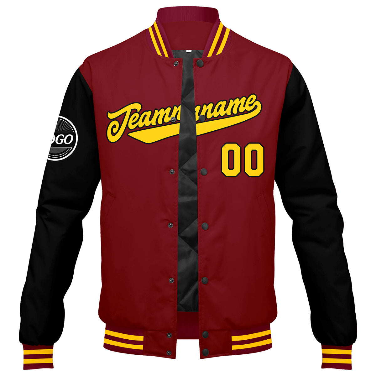 Benutzerdefinierte Verlauf Varsity-Jacke. Letterman-Jacke Karminrot Schwarz Gelb