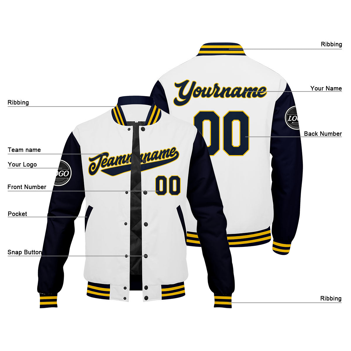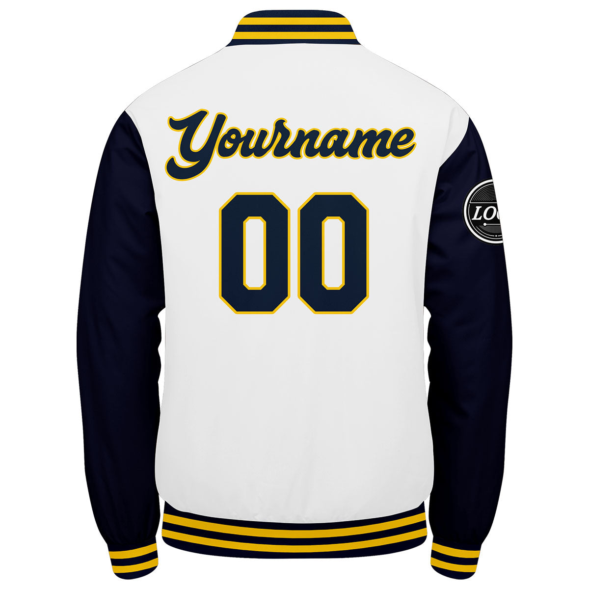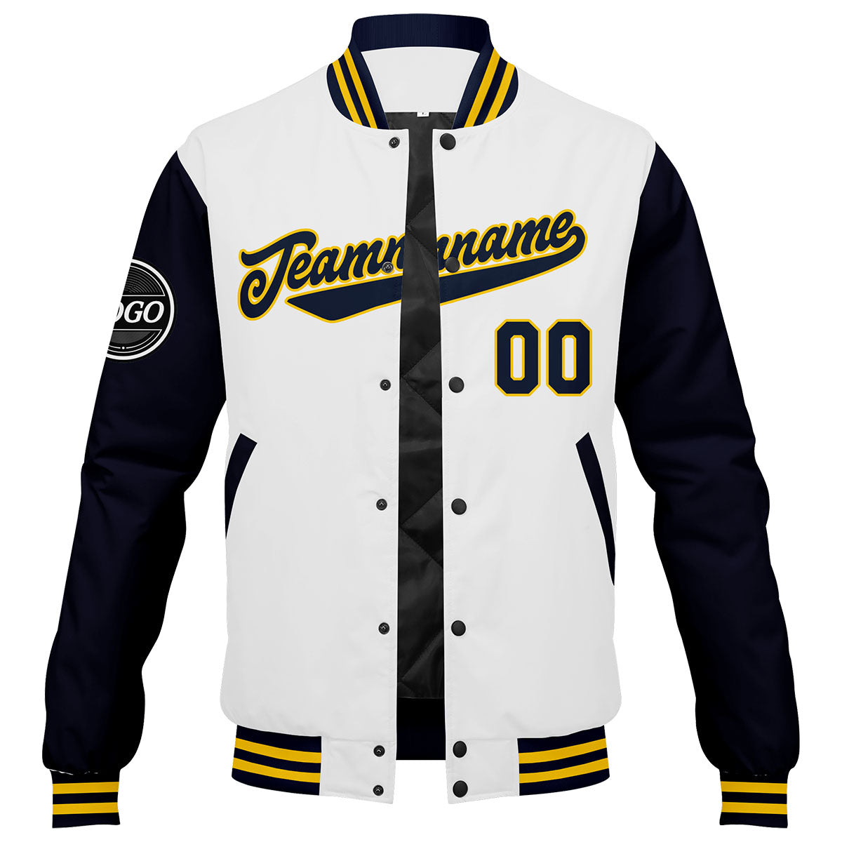 Benutzerdefinierte Verlauf Varsity-Jacke. Letterman-Jacke Marine Weiß Gelb