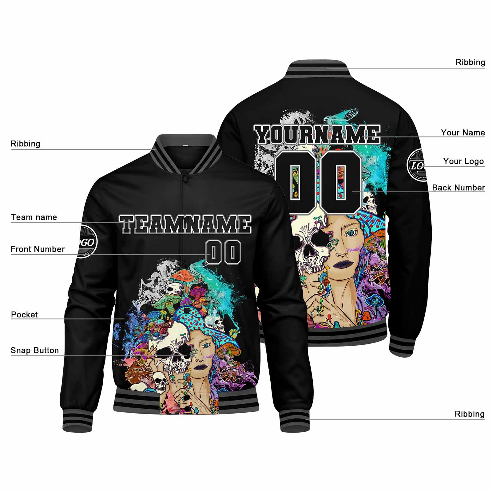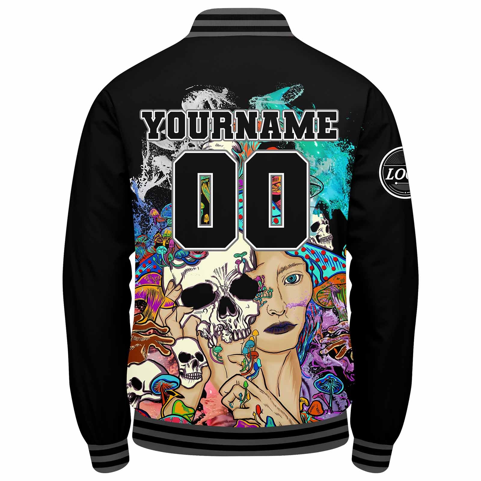 Diese Varsity-Jacke verfügt über einen personalisierten Letterman-Jacken-Stil mit genäht Namen, Nummer und Logo.