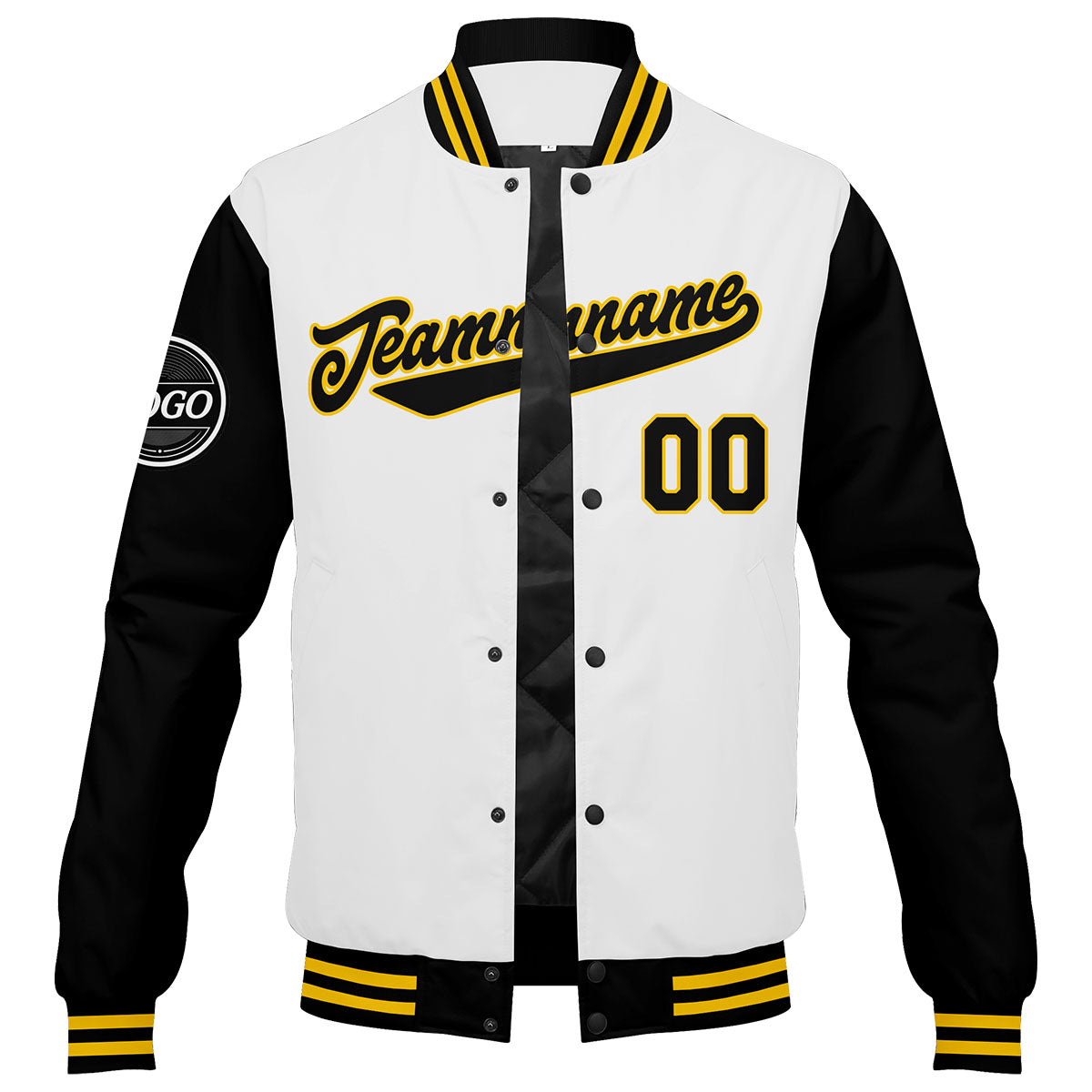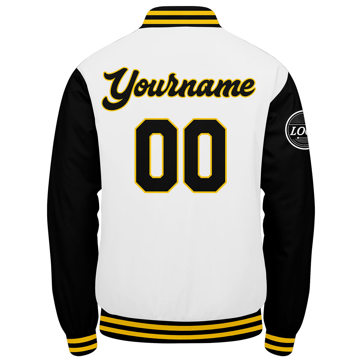Diese Varsity-Jacke verfügt über einen personalisierten Letterman-Jacken-Stil mit genäht Namen, Nummer und Logo.