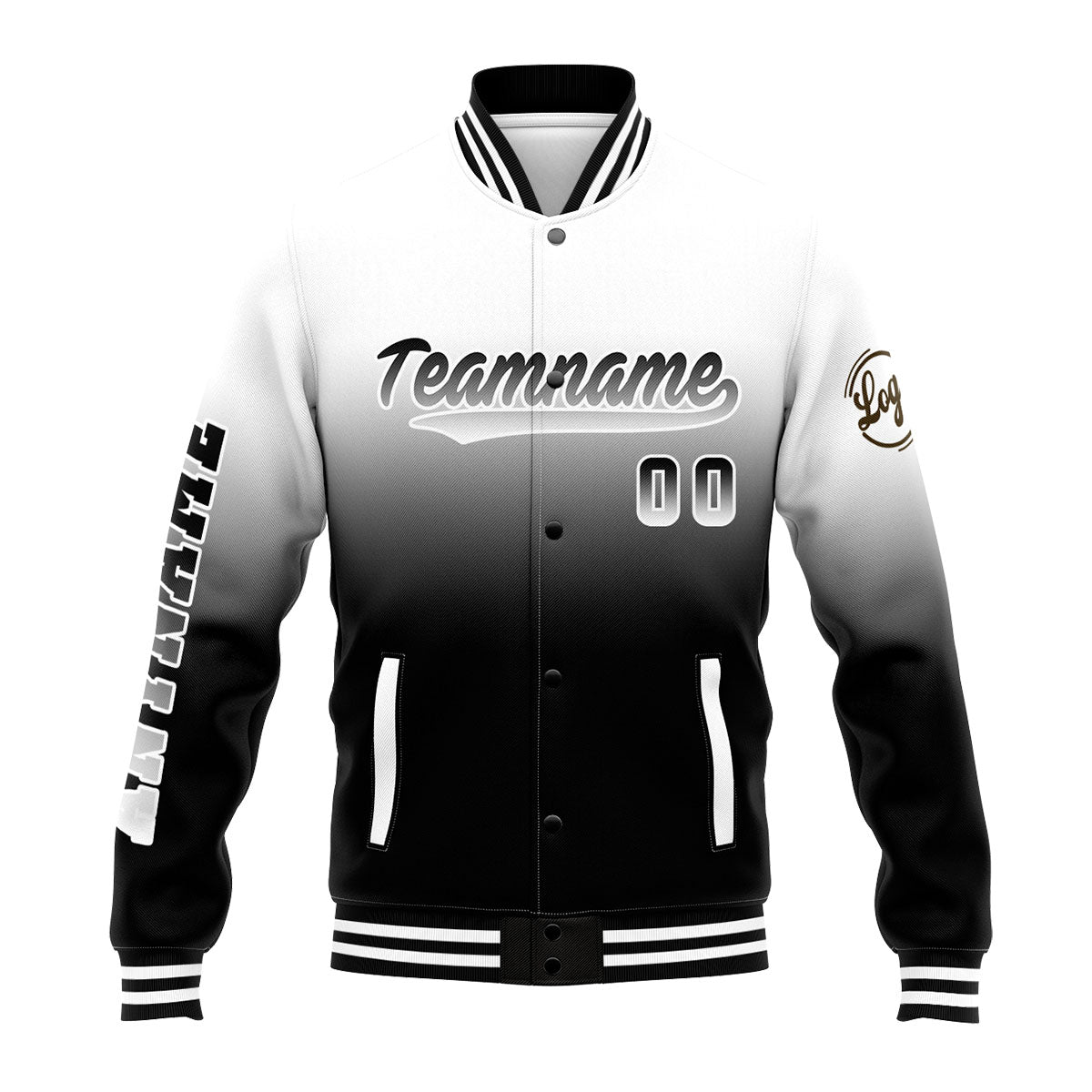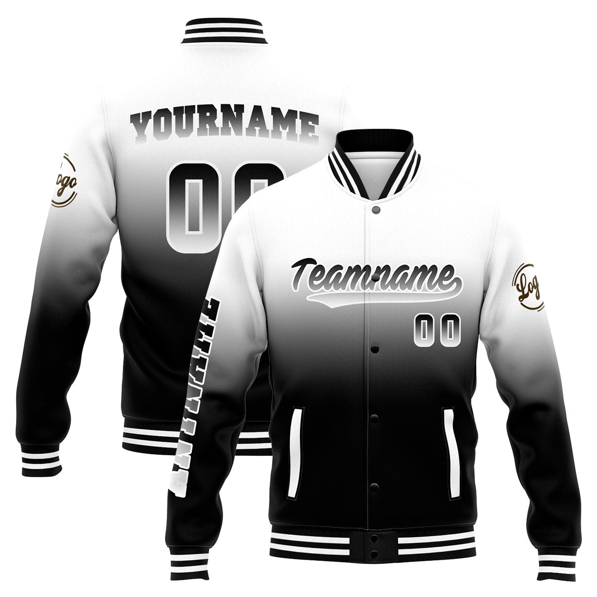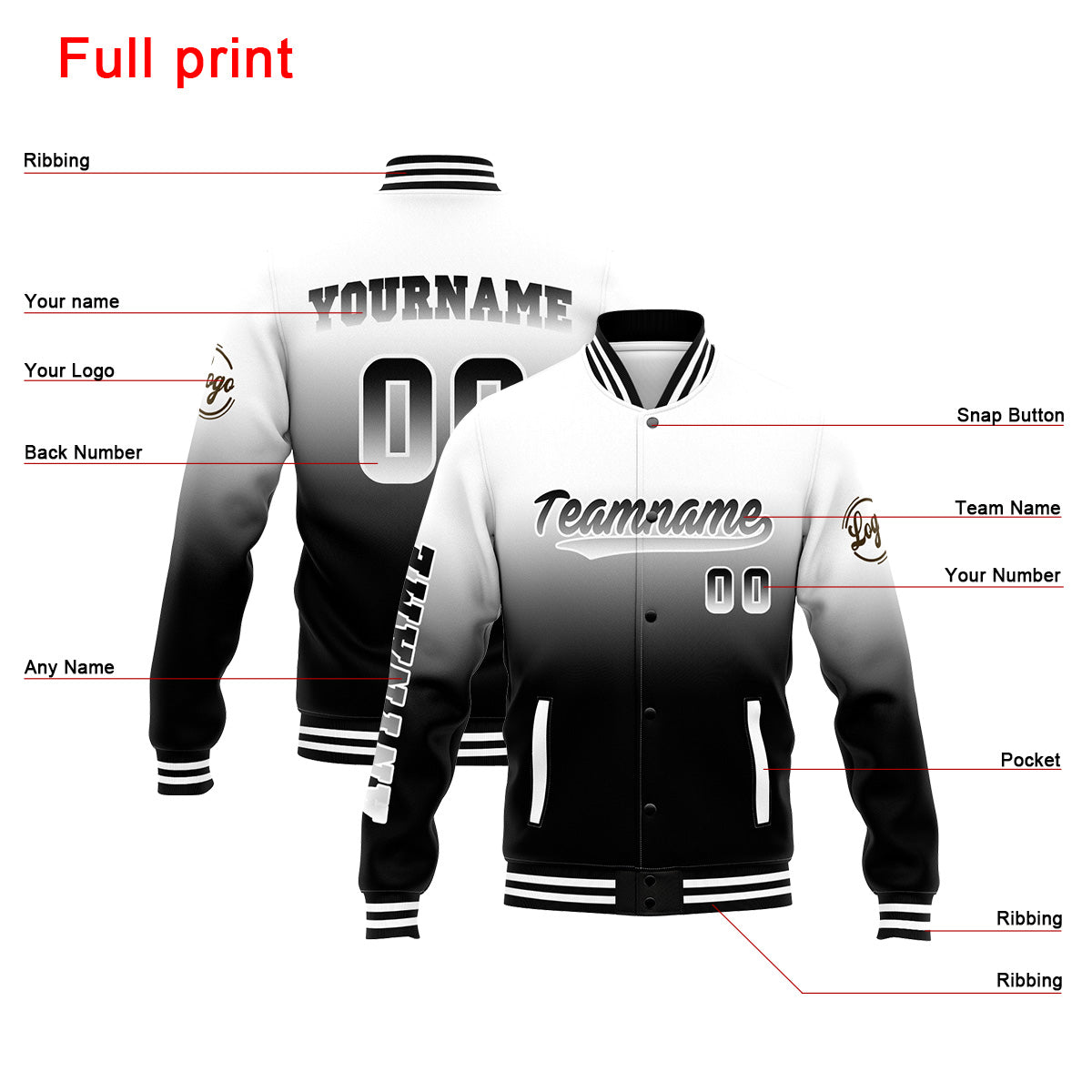 Diese Varsity-Jacke verfügt über einen personalisierten Letterman-Jacken-Stil mit gedrucktem Namen, Nummer und Logo.