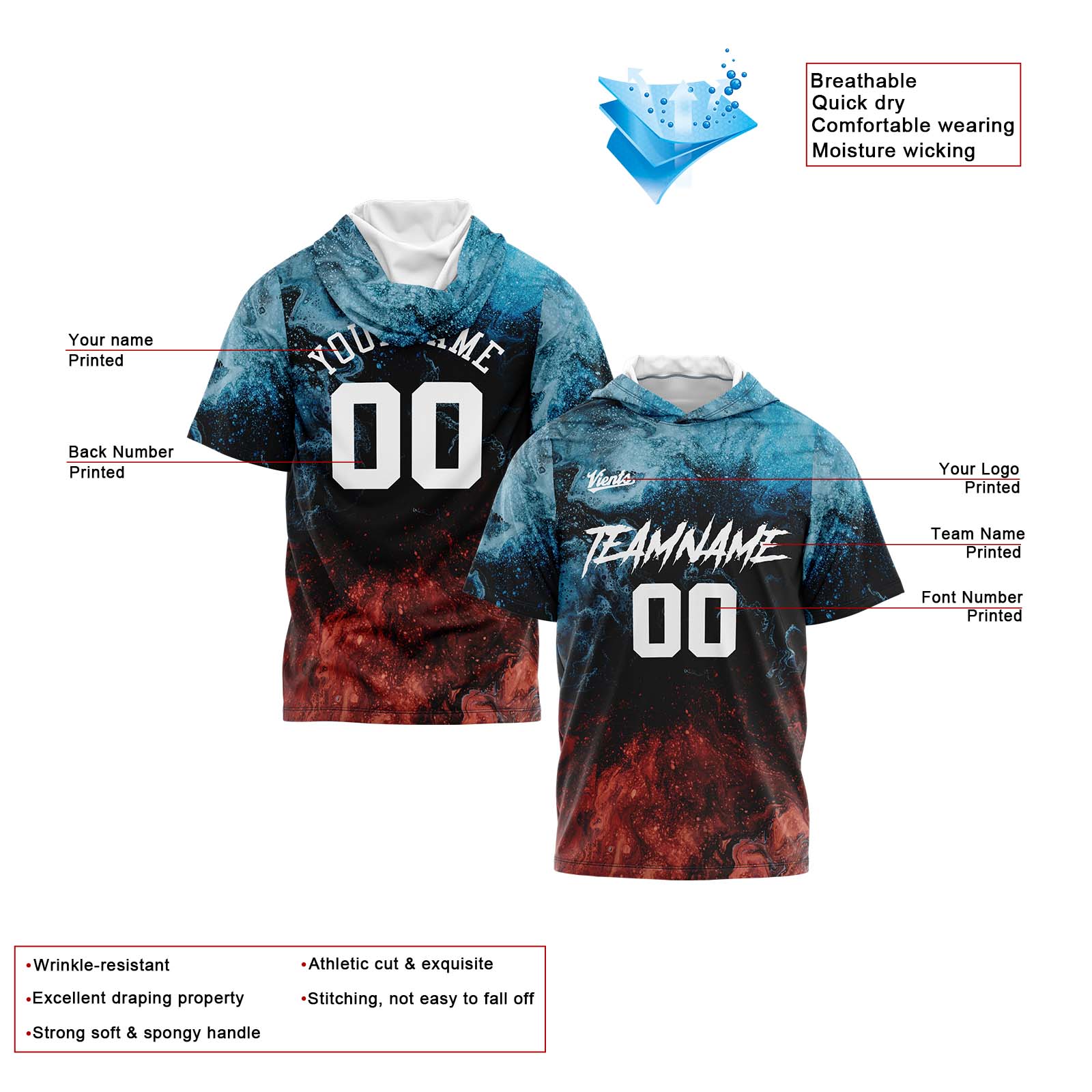 Benutzerdefinierte Wasser und Feuer Kurzarm-Kapuzenpullover für Männer Frauen Hemden mit Kapuzen gedruckt Name Logo
