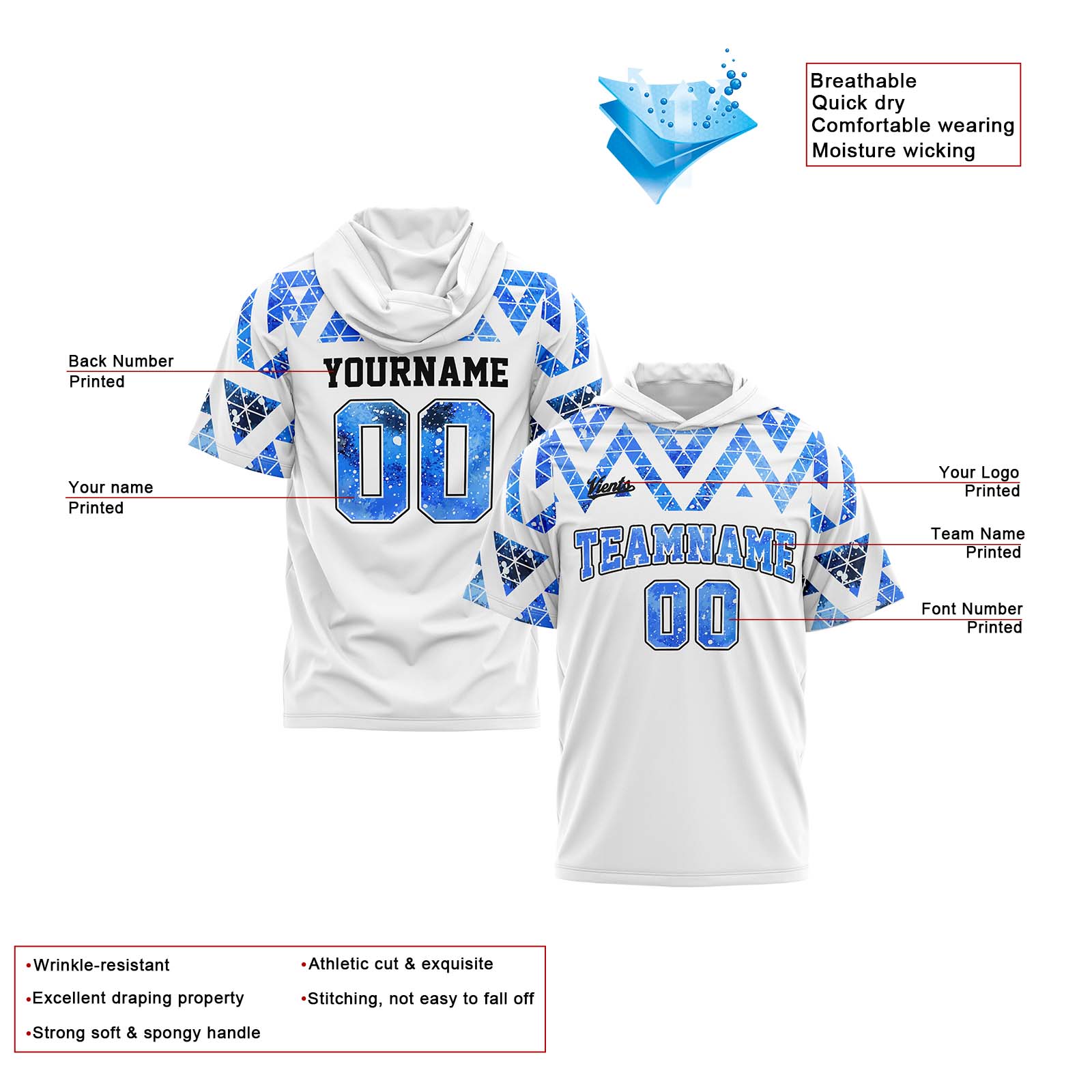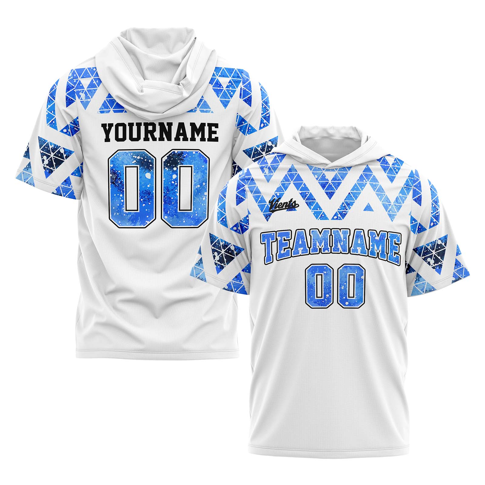 Benutzerdefinierte Weiß Blau  Kurzarm-Kapuzenpullover für Männer Frauen Hemden mit Kapuzen gedruckt Name Logo