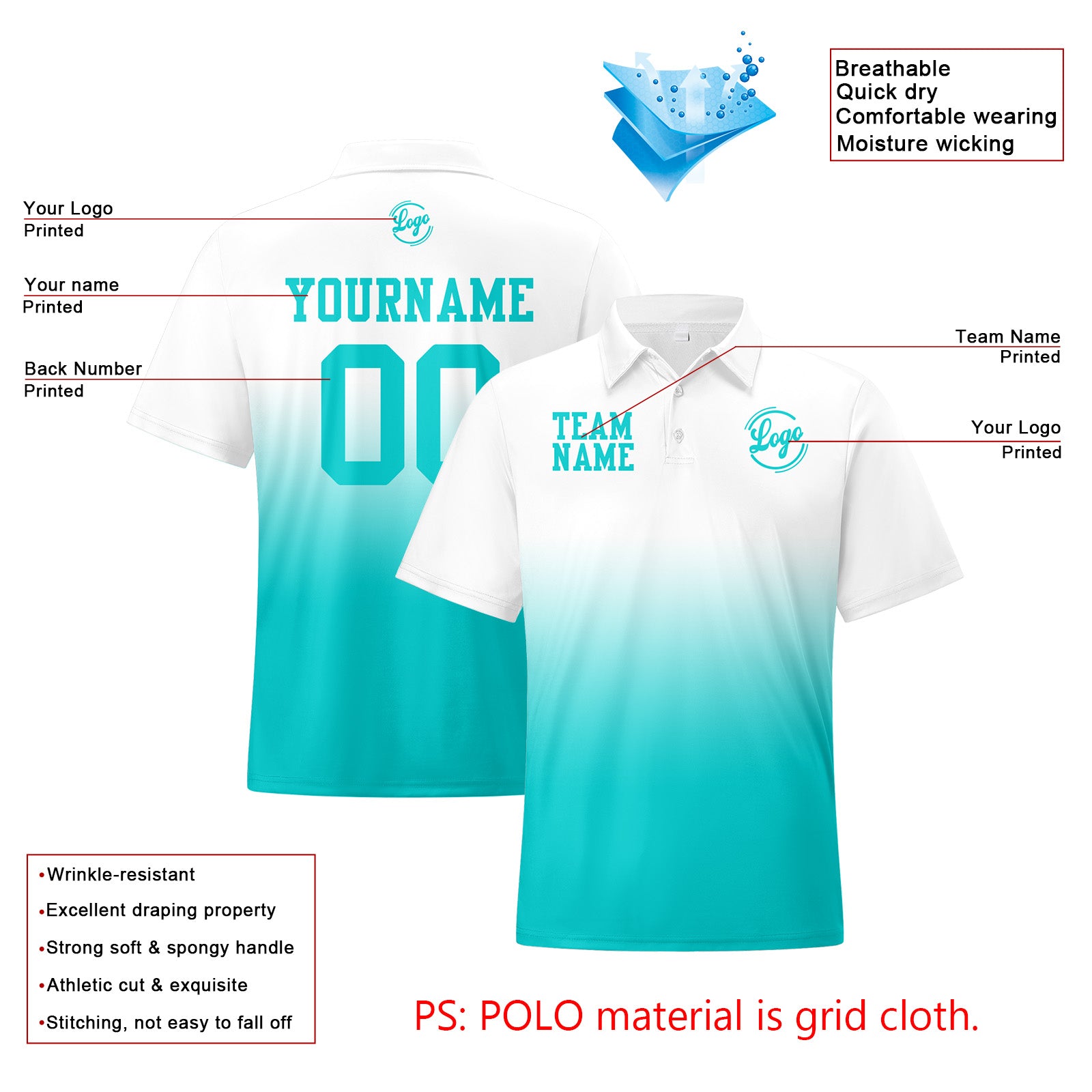 Benutzerdefinierte Weiß Cyan Fußball Gradient Polo-Shirts Fügen Sie Ihr Einzigartiges hinzu Logo/Name/Nummer